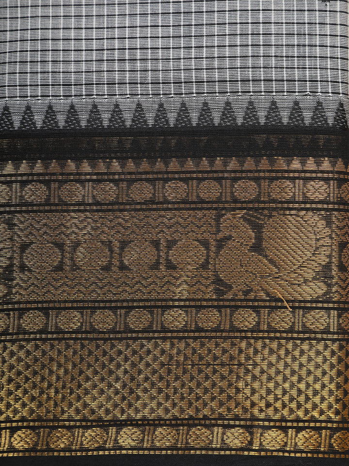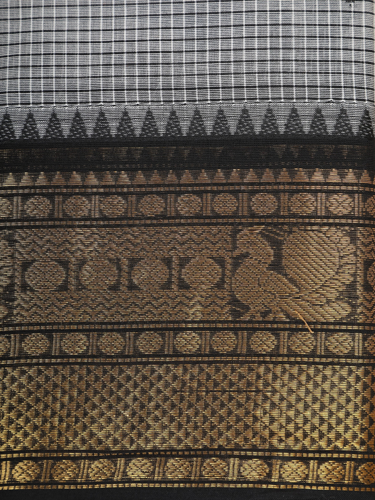 Grey Checks Design Cotton Saree with Black Zari Woven Border