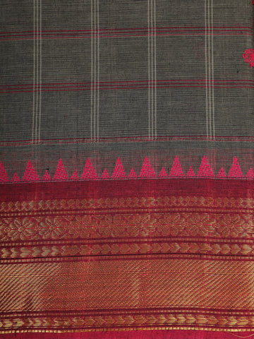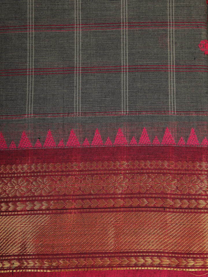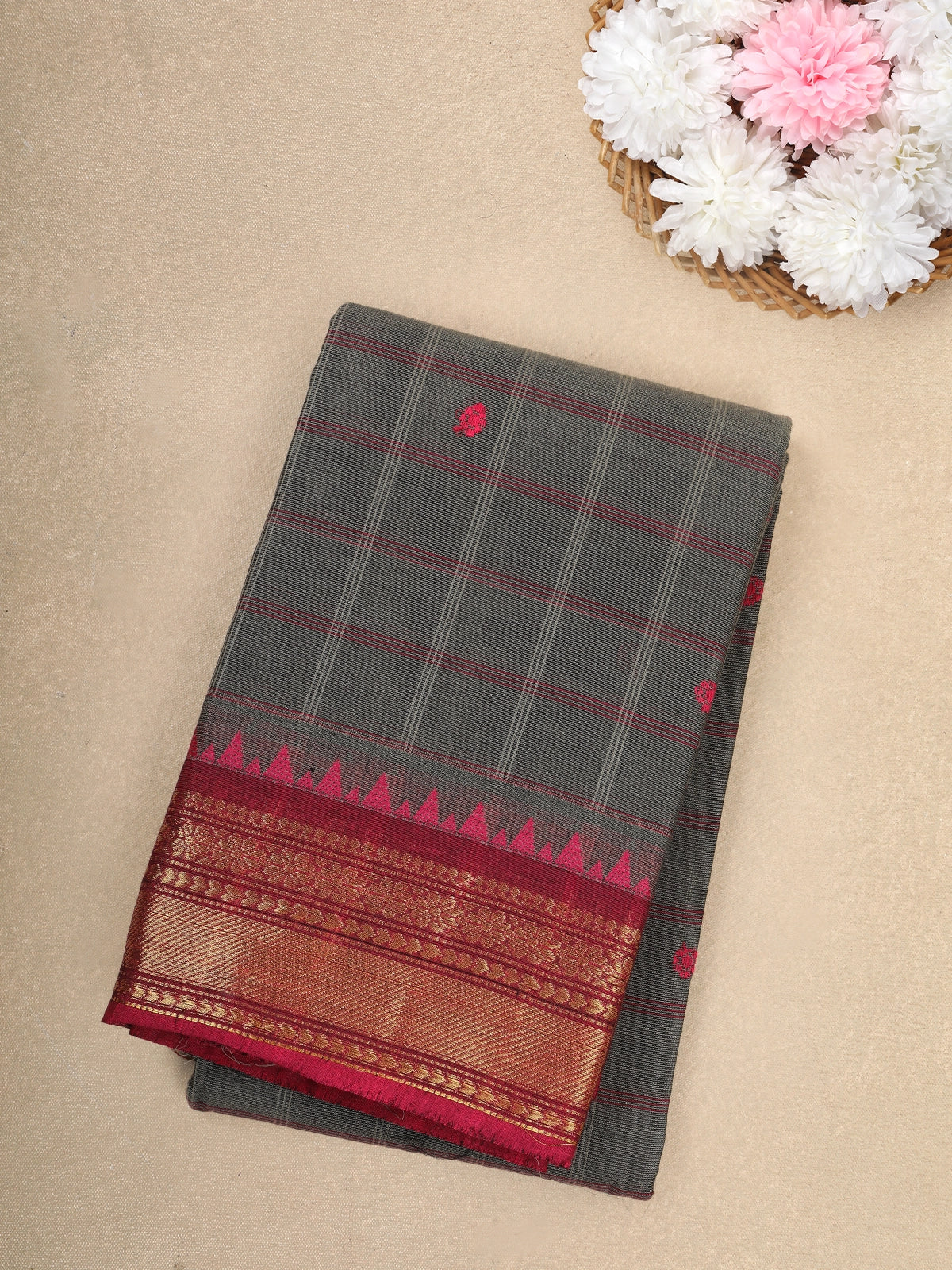 Grey Checks Design Cotton Saree with Red Zari Woven Border