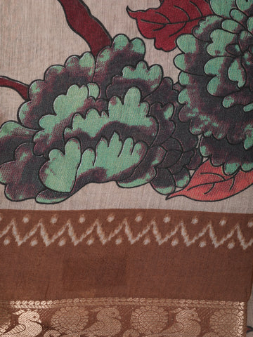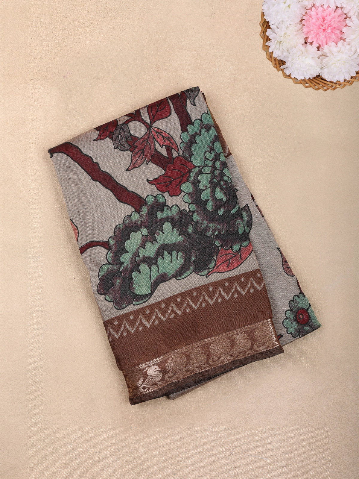 Grey Floral Printed Design Chanderi Cotton Saree with Contrast Zari Woven Border