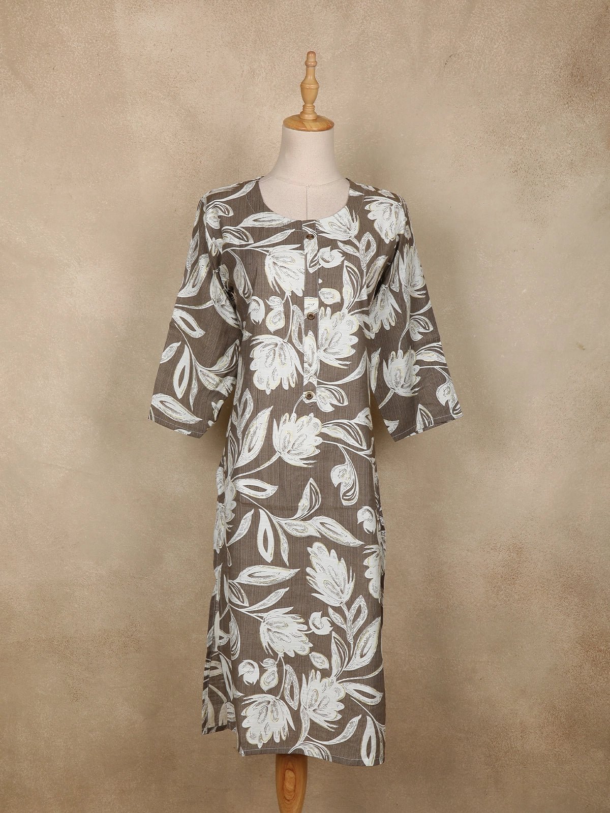 The soothing grey base is beautifully elevated with bold floral prints in contrasting shades, creating a chic yet minimal aesthetic. Featuring a round neckline with a subtle front slit, and a button-down front, this kurti balances tradition with modern charm. The 3/4th sleeves and straight-cut silhouette offer a flattering fit for all body shapes.
