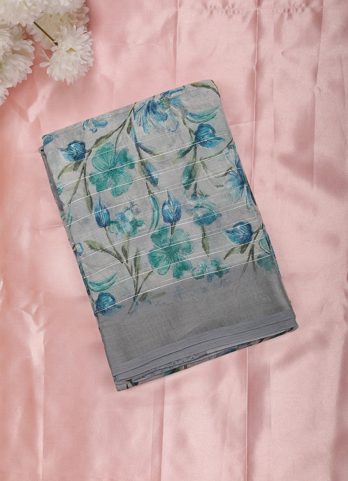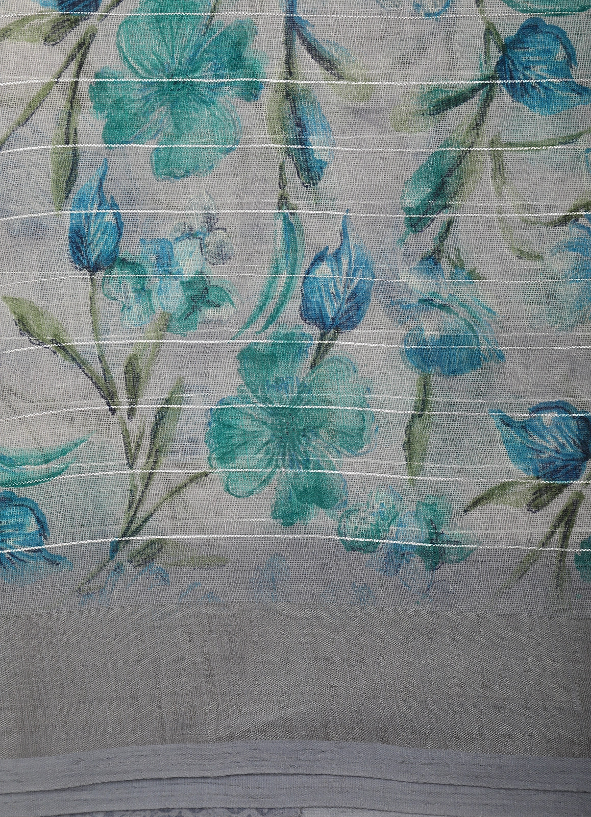 Embrace understated elegance with this soft grey linen cotton saree, beautifully enhanced by soothing floral prints in shades of teal blue and sea green. The delicate botanical motifs are thoughtfully spread across the body, while fine horizontal stripe detailing adds a subtle textured finish that elevates the overall look. Crafted from a breathable linen cotton blend, this saree offers a light, airy drape with natural comfort.