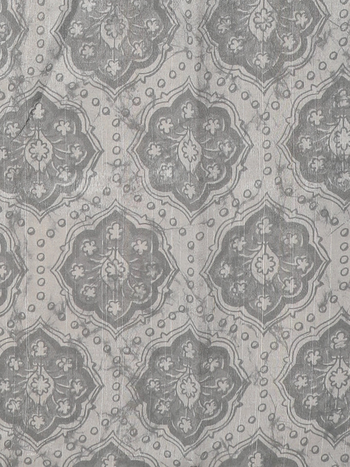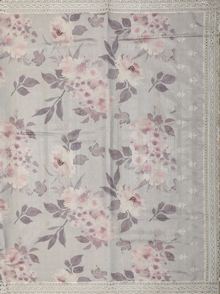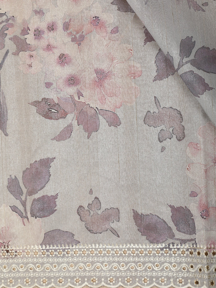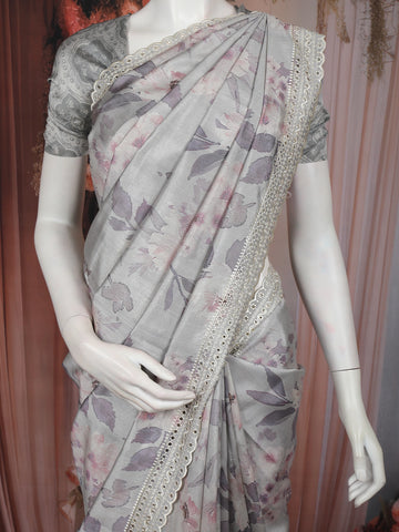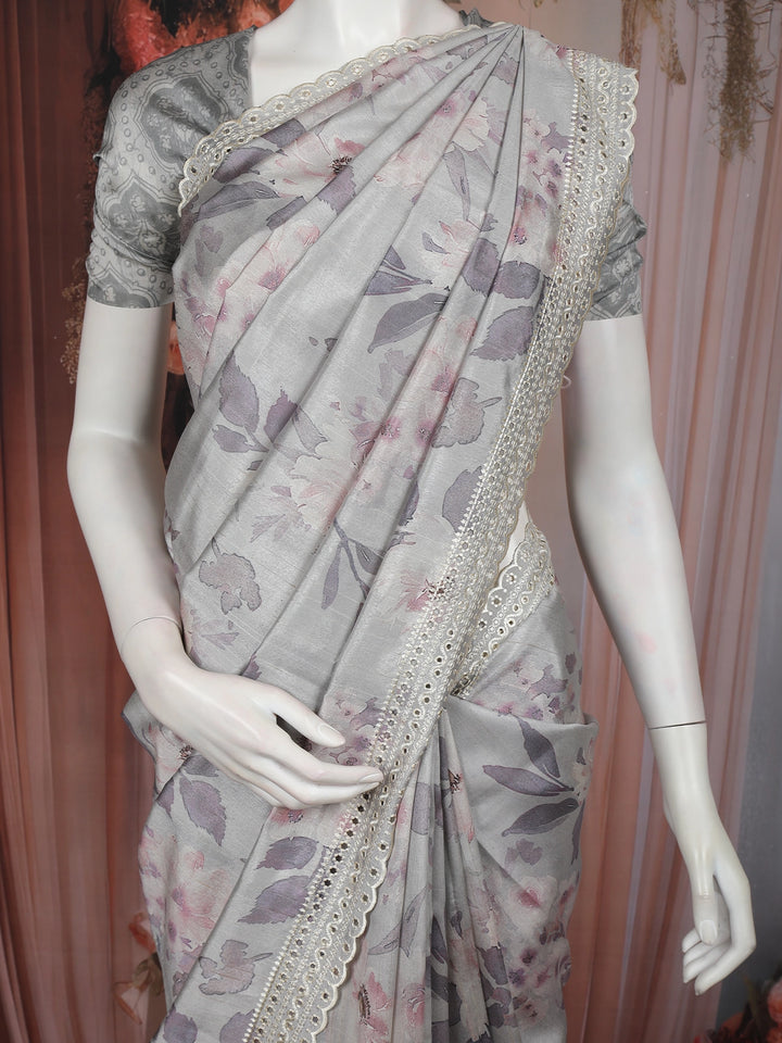 Grey Floral Printed Design Tussar Saree with Embroidered Lace Border