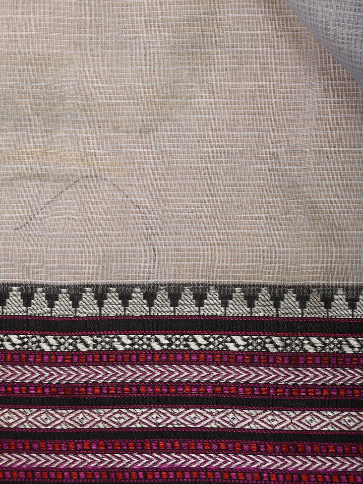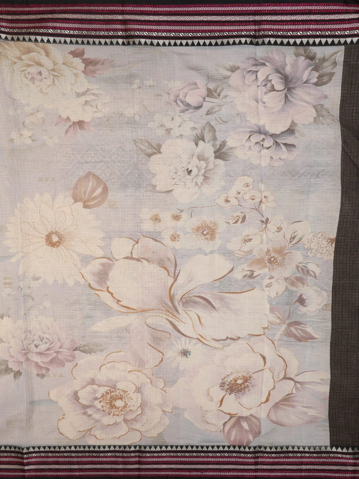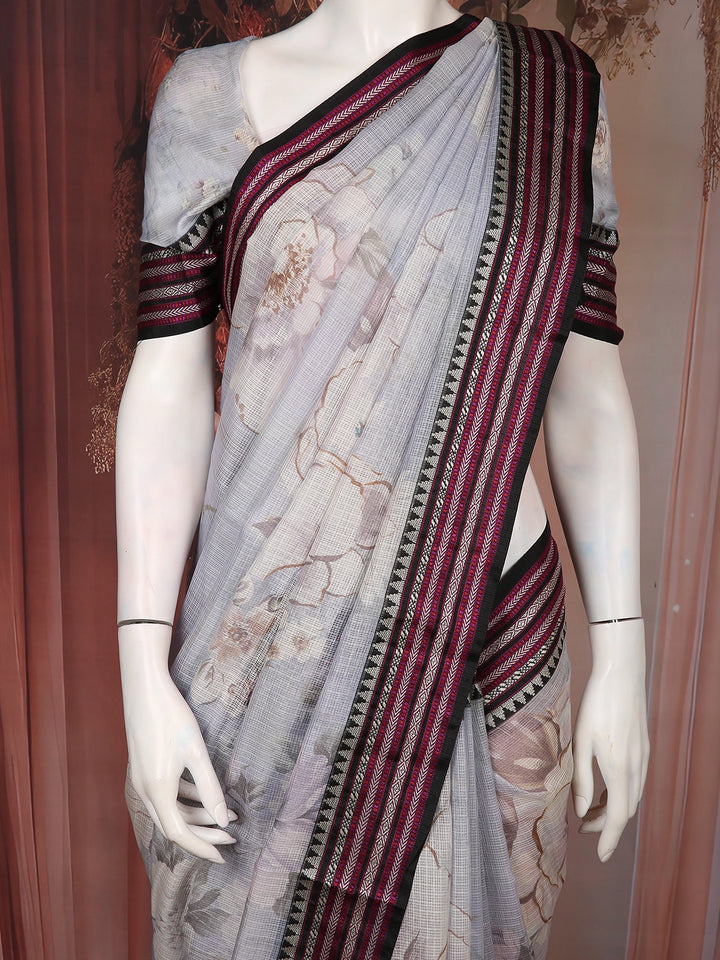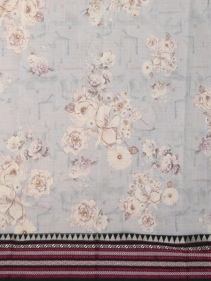 Grey Floral Printed Kota Cotton Saree with Contrast Woven Border
