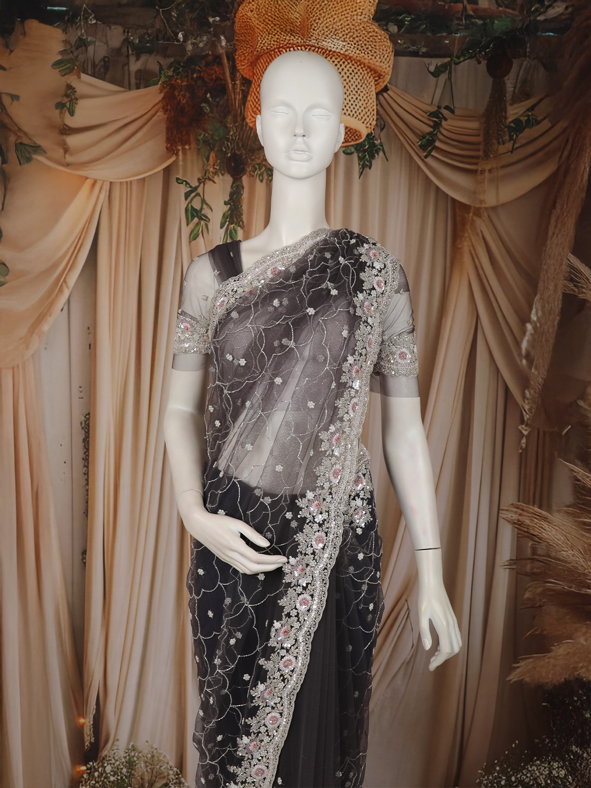 Step into refined glamour with this elegant grey net designer saree, exquisitely crafted to deliver a perfect blend of sophistication and sparkle. The sheer net base is beautifully adorned with intricate floral motifs, highlighted by fine sequins and delicate bead embellishments that shimmer subtly with every movement.