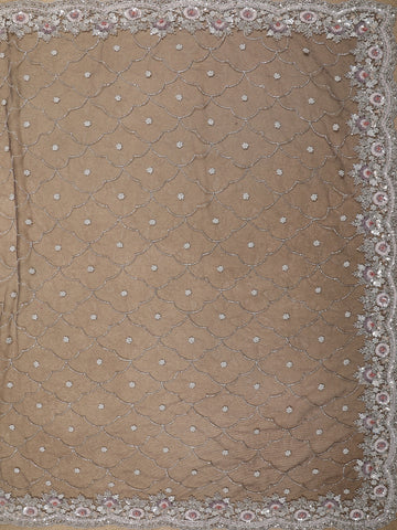 The saree features an all-over embroidered pattern that adds depth and texture, while the gracefully designed embellished border enhances its luxurious appeal. The soft grey tone offers a contemporary yet timeless charm, making it an ideal choice for evening occasions and grand celebrations.