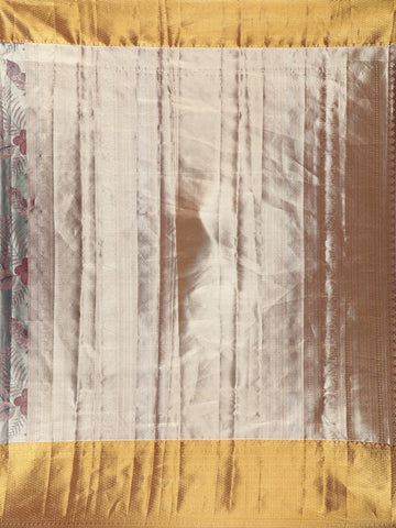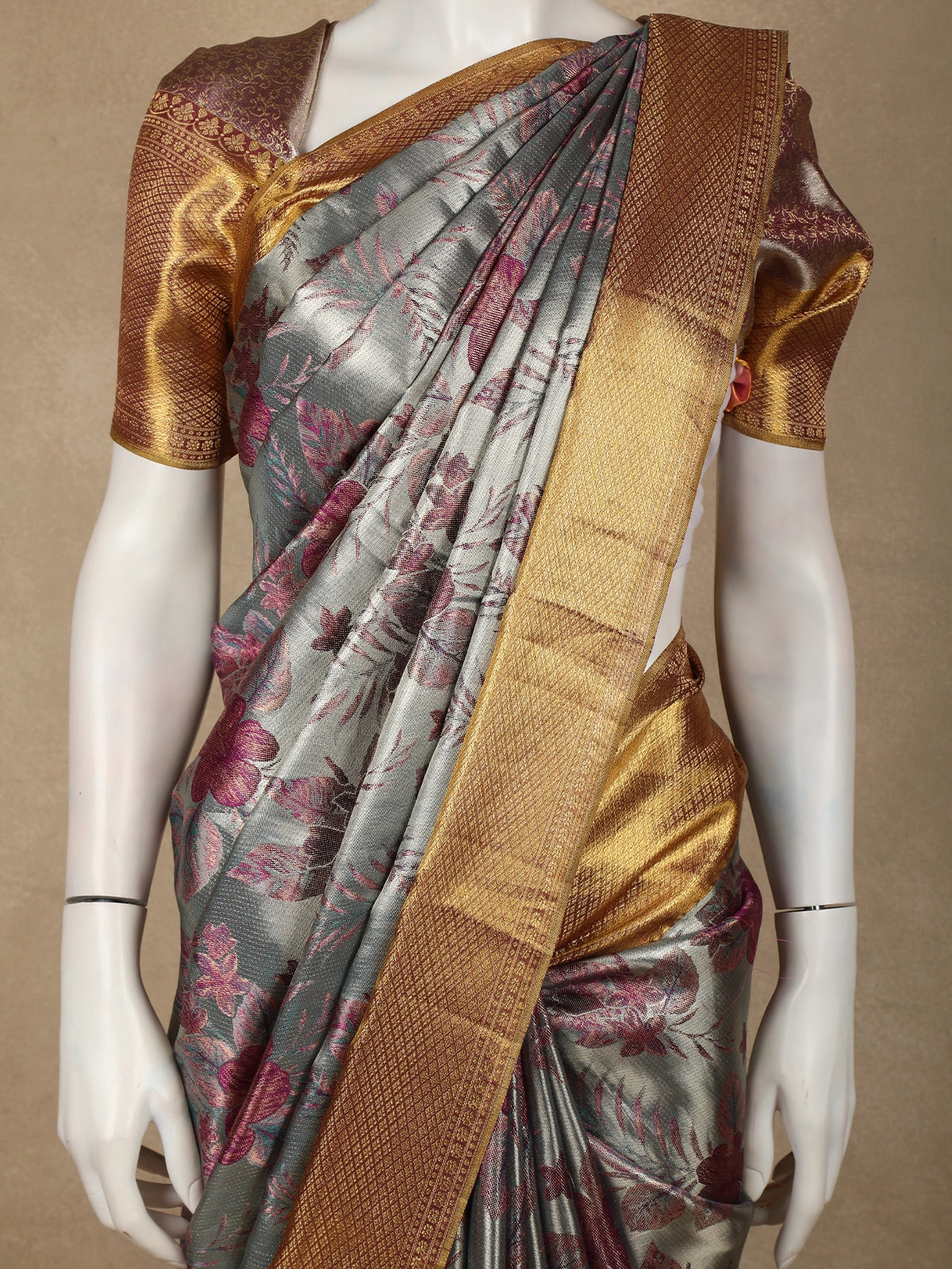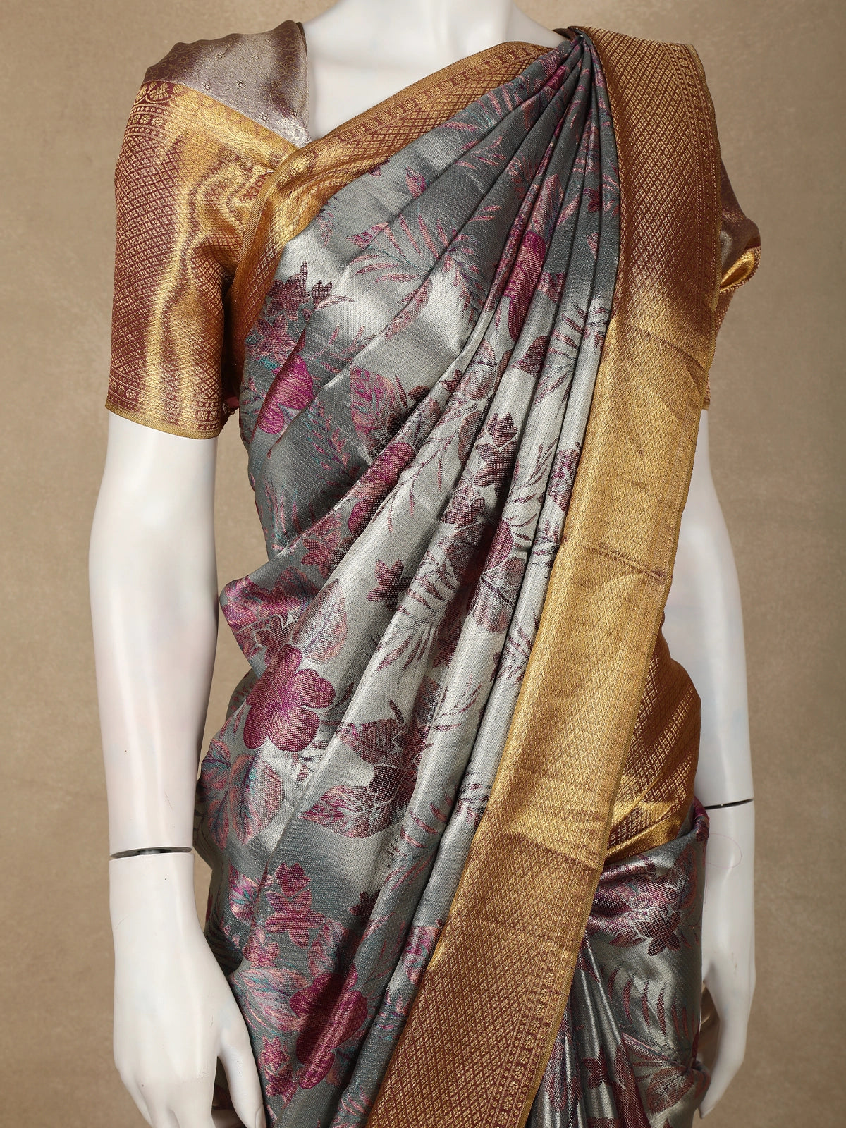 Grey Floral Woven Tissue Silk Saree with Antique Gold Zari Border