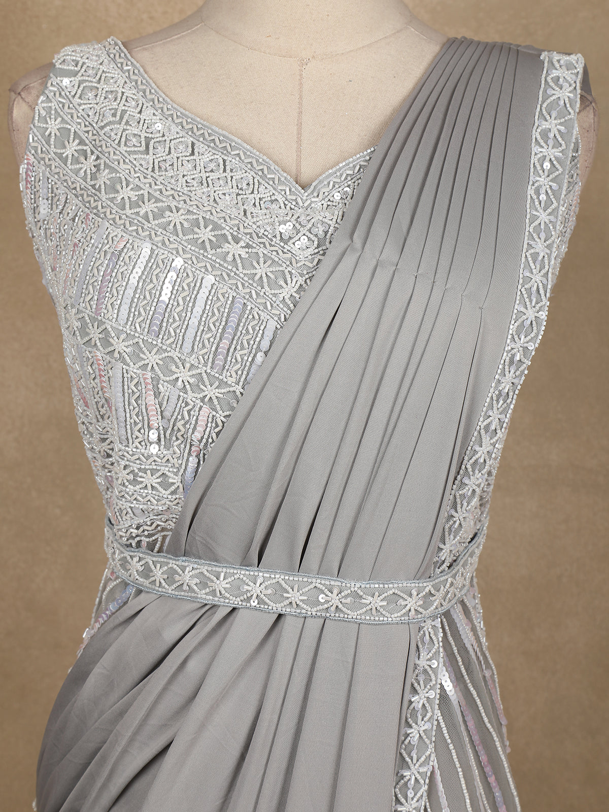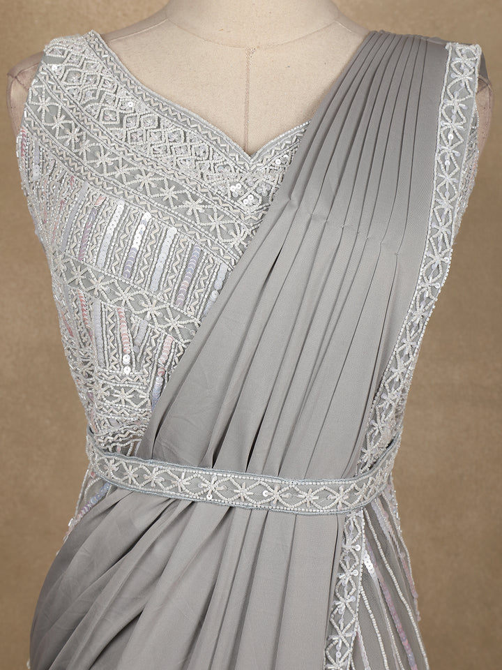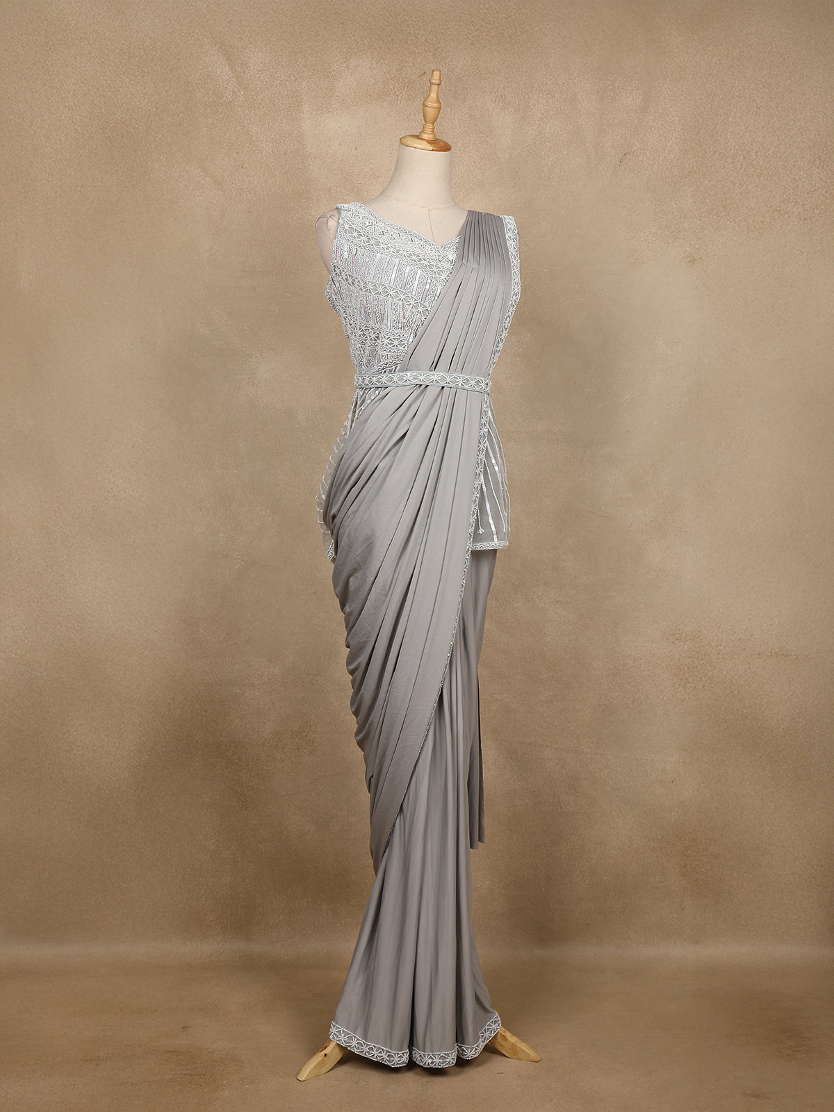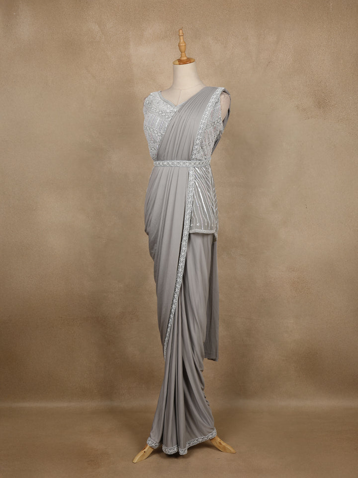Grey Sequins Embroidered Lyrca Ready To Wear Saree With Designer Blouse