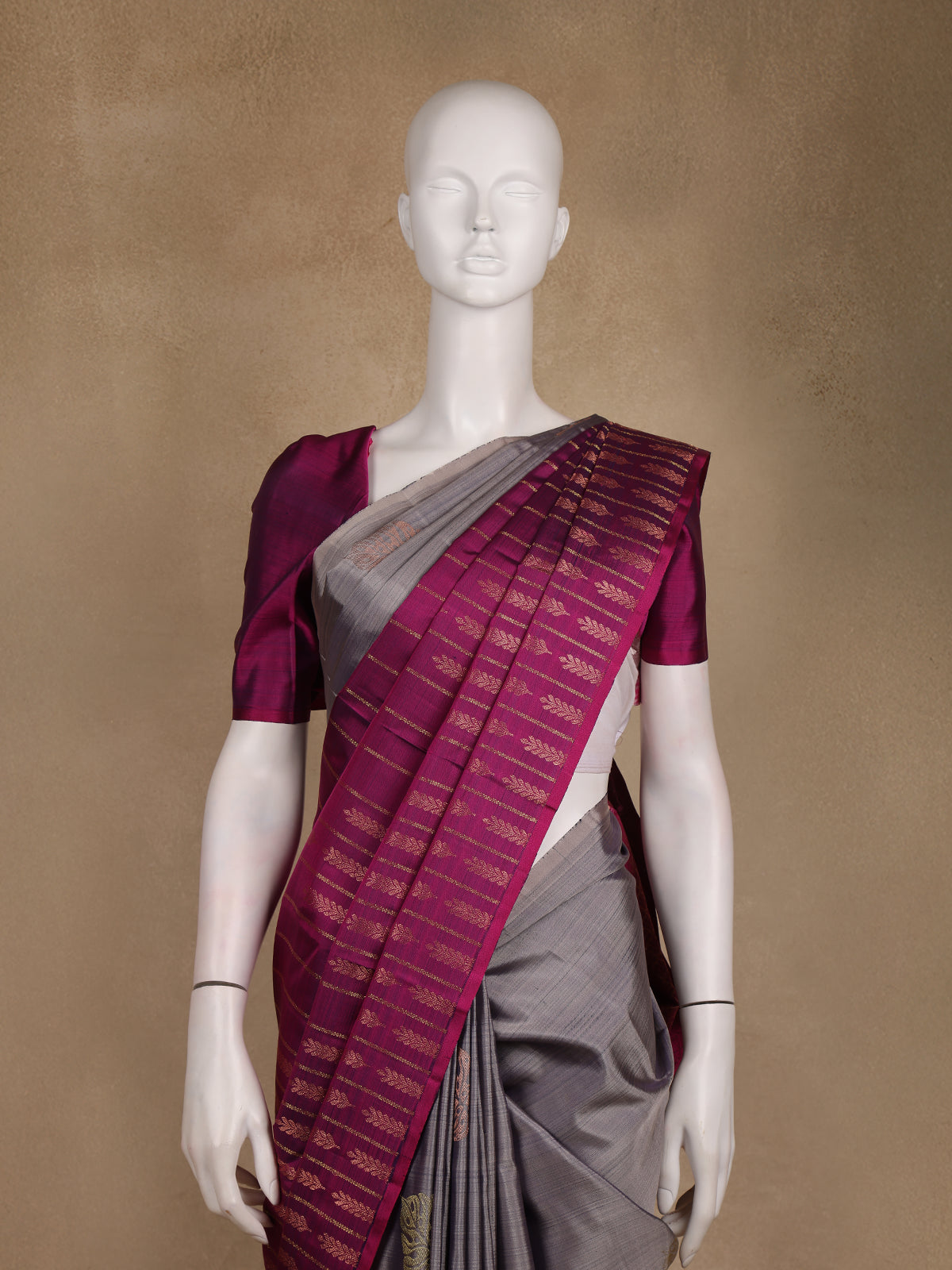 Drape yourself in timeless elegance with this exquisite Grey Kanchipuram Silk Saree, a perfect blend of sophistication and traditional grandeur. The subtle grey body is elevated with finely woven zari accents, lending a refined charm that makes it ideal for festive occasions and celebrations.