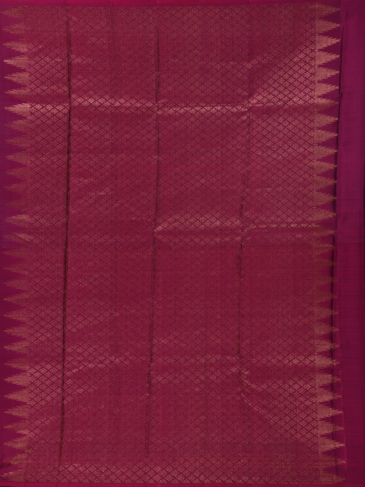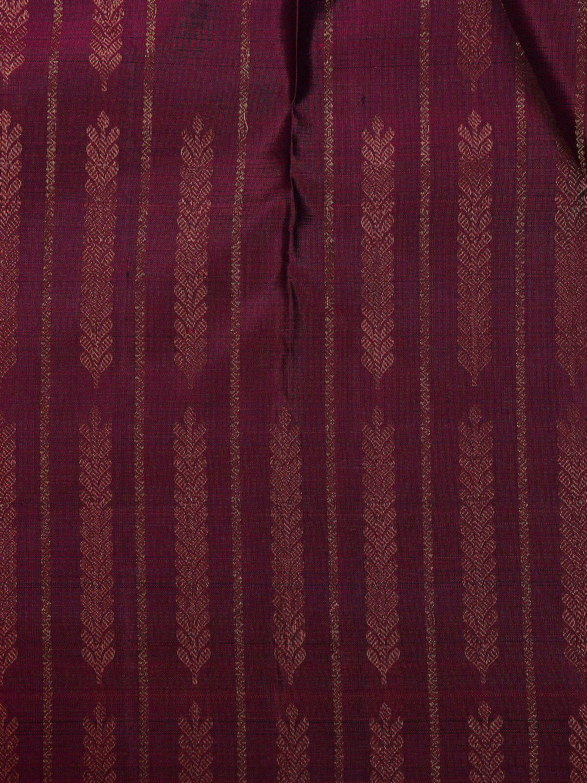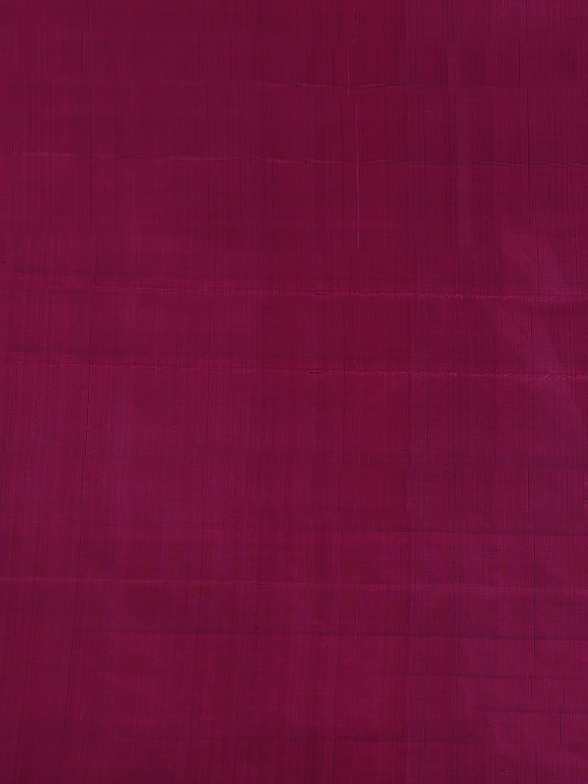 The highlight of this saree is its contrasting magenta pallu and blouse, adorned with intricate zari woven patterns that add richness and regal appeal. The zari border frames the saree beautifully, enhancing its overall appeal with a luxurious touch.
