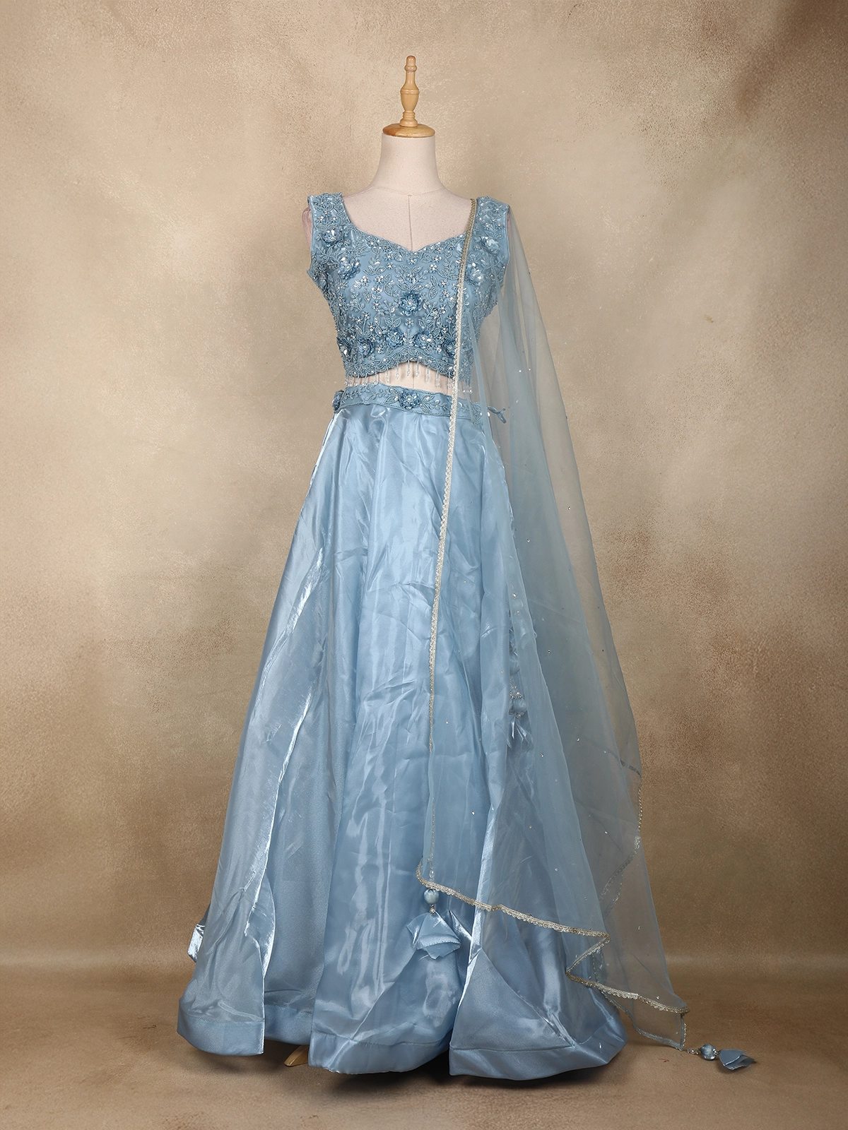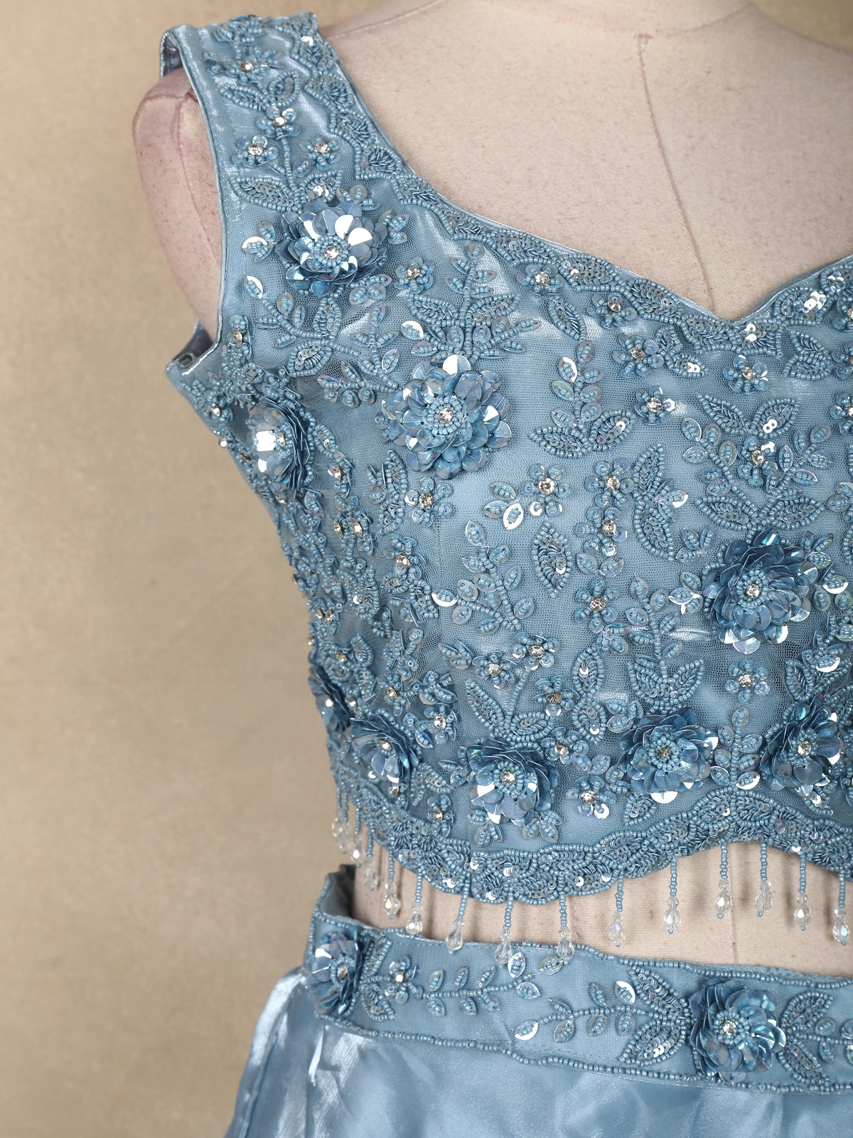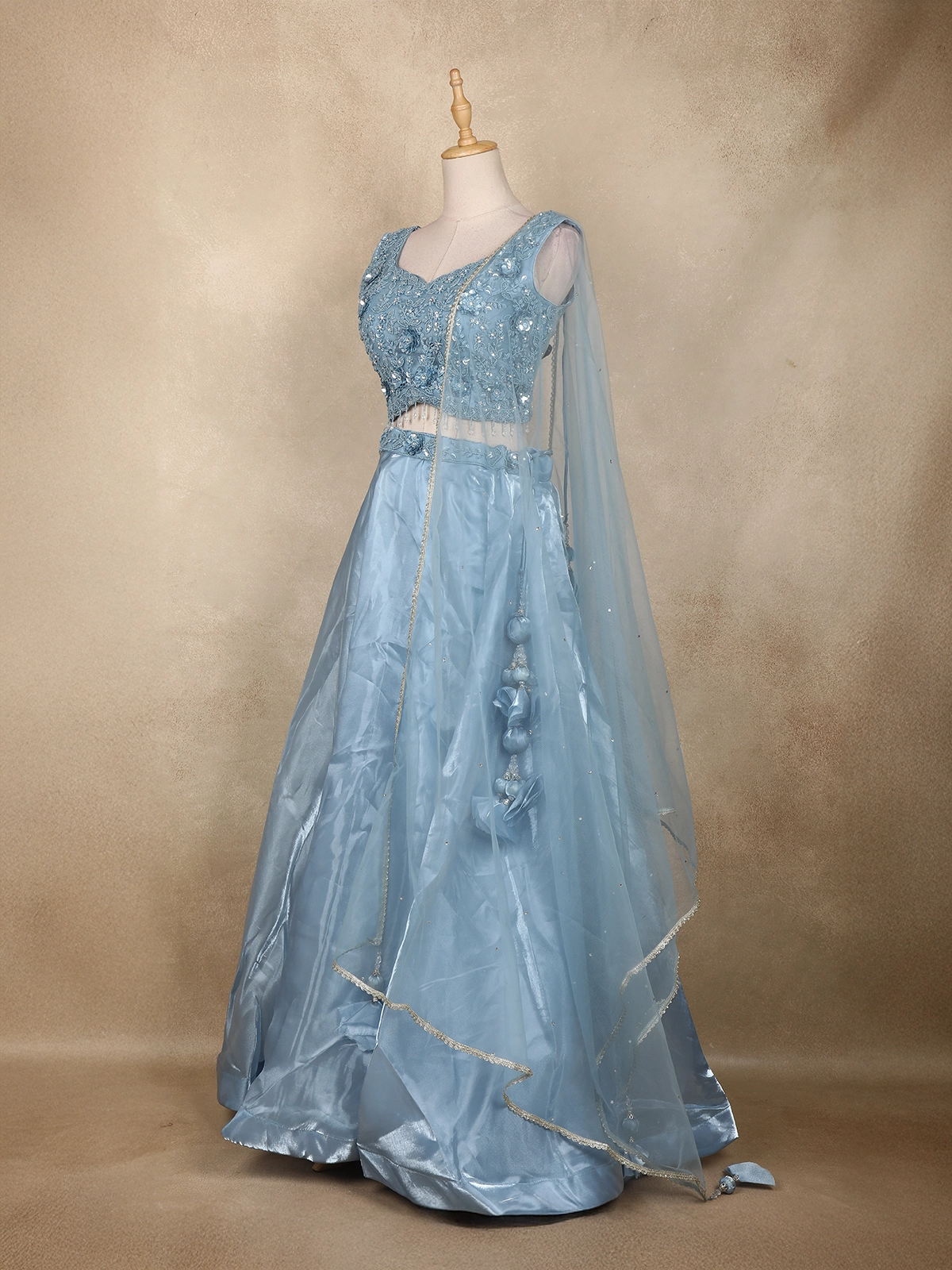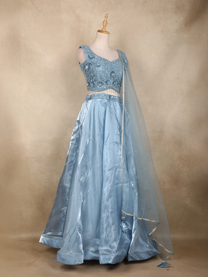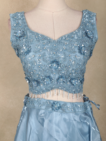 Make every celebration unforgettable with this mesmerizing Ice Blue Lehenga Set — crafted for those who love an elegant fairytale look. The sleeveless blouse is adorned with 3D floral detailing, shimmering sequins, beads, and sparkling stone accents that add a luxurious touch. The delicate beaded tassels at the waistline lend a charming modern twist.
