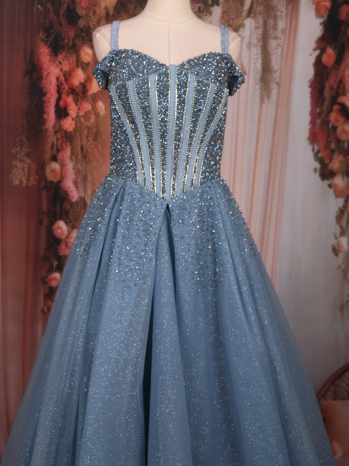 Step into a fairy-tale moment with this enchanting Ice Blue Ball Gown, masterfully designed for those who love to shine with sophistication. The gown features a structured bodice adorned with intricate bead and sequin embellishments, creating a stunning textured sparkle that catches the light beautifully from every angle. The corset-inspired panel detailing enhances the silhouette, offering a flattering, defined fit at the waist.