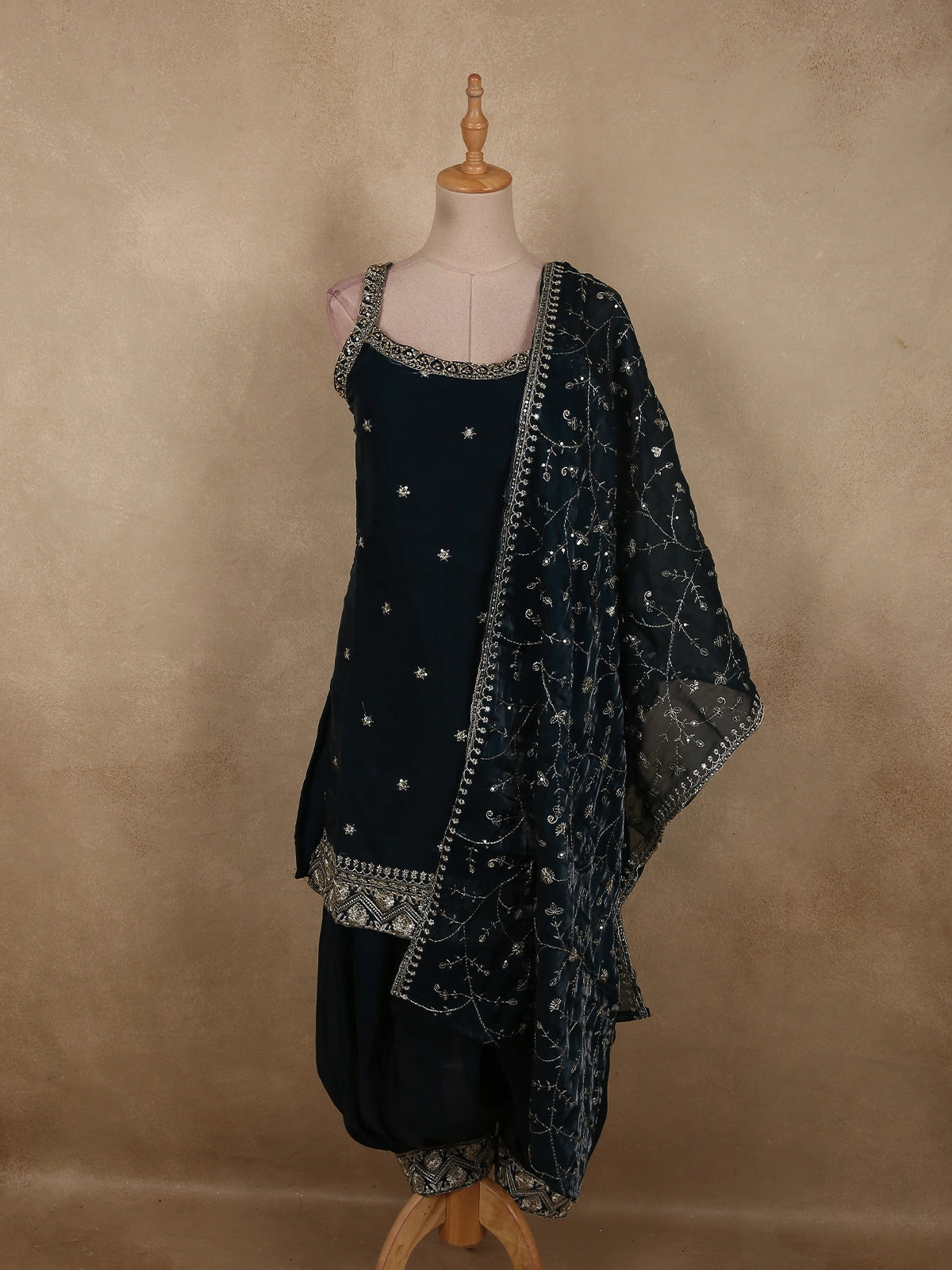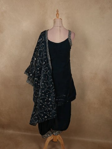 Ink Blue Floral Sequins and Beads Embroidered Design Satin Salwar Suit with Dupatta