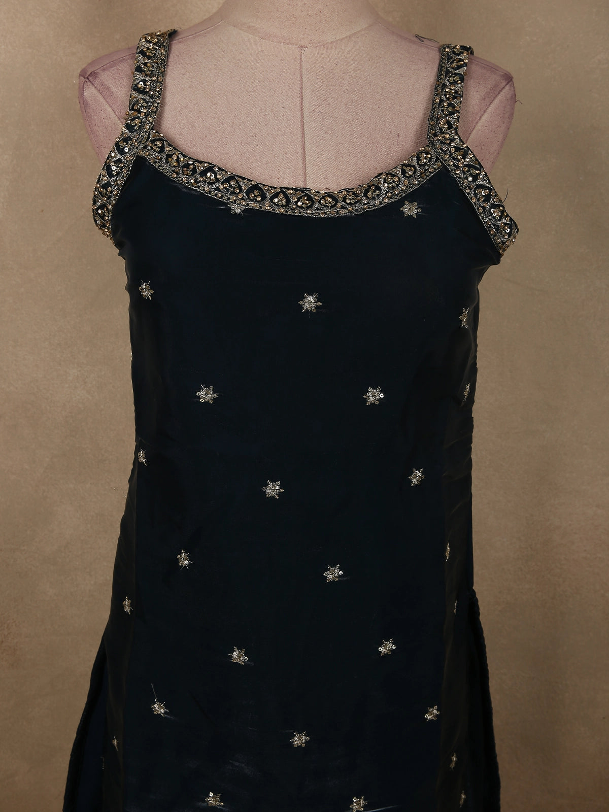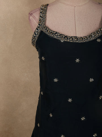 The kurta is adorned with delicate floral sequins and bead embroidery, subtly scattered across the body to create a refined sparkle. The neckline and strap detailing feature intricate embellishments with fine bead and zari accents, adding depth and a statement finish. The hemline is richly bordered with detailed embroidery, elevating the overall grandeur of the outfit.