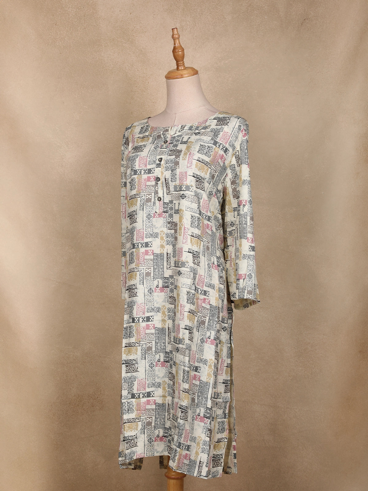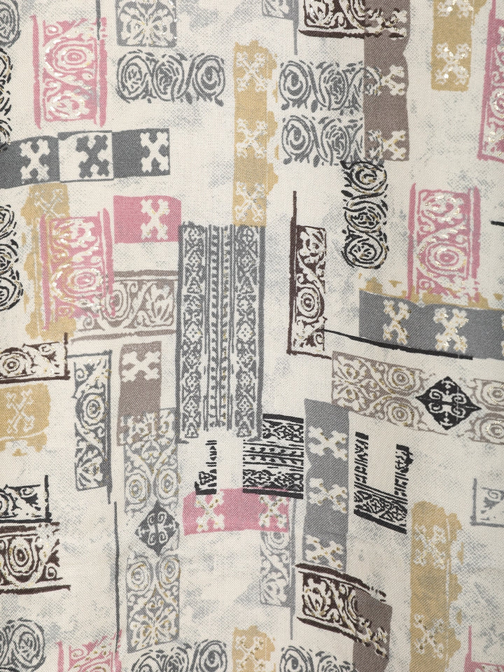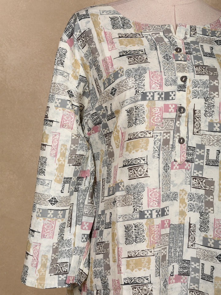 Elevate your everyday style with this Ivory Abstract Printed Cotton Kurti, featuring a creative blend of geometric and artistic block motifs in soothing tones of grey, beige, and pastel pink. Crafted from soft, breathable cotton fabric, it offers all-day comfort while maintaining a sophisticated look.