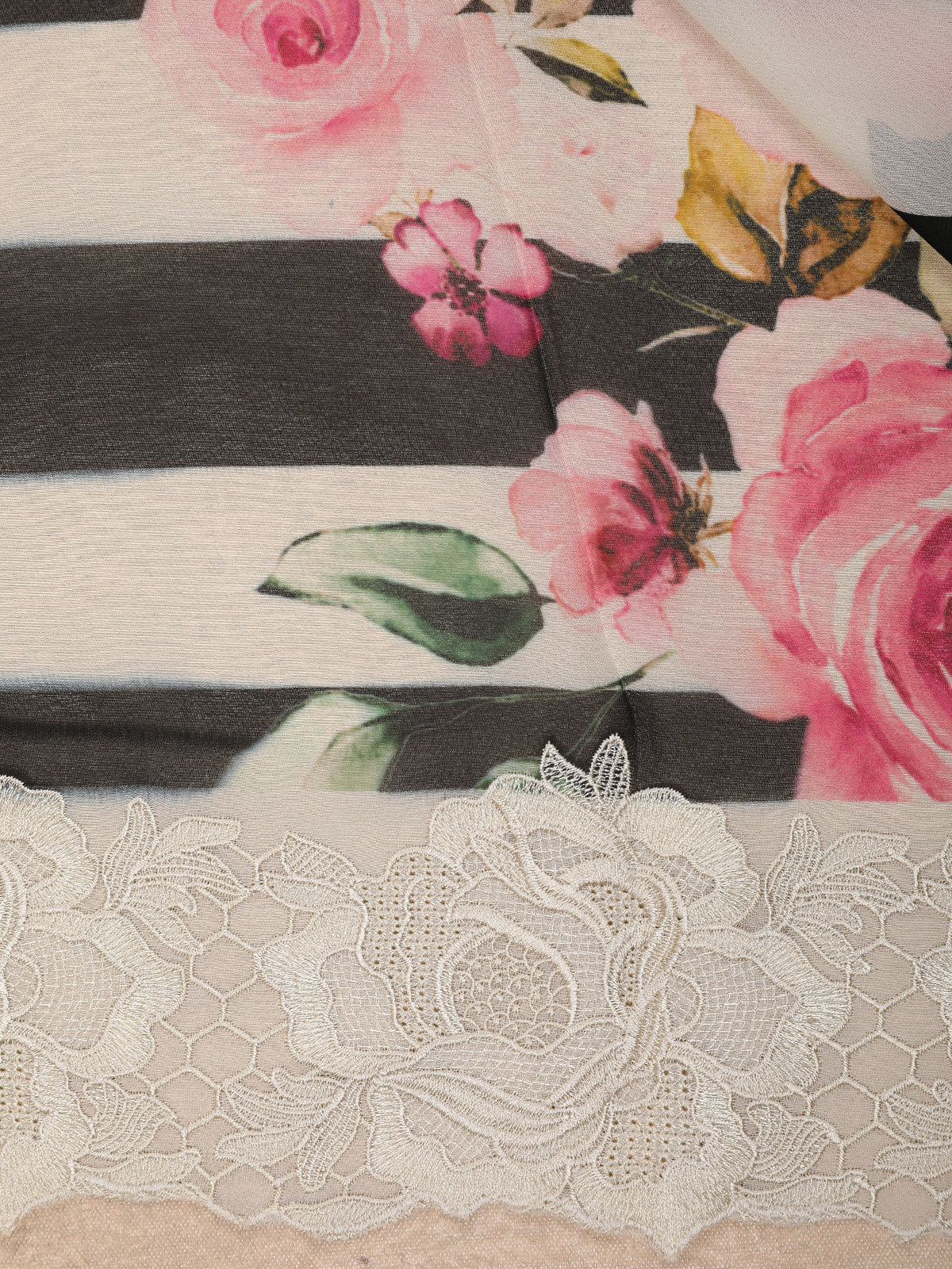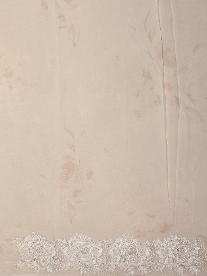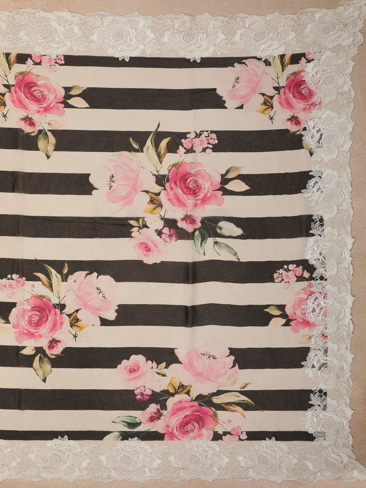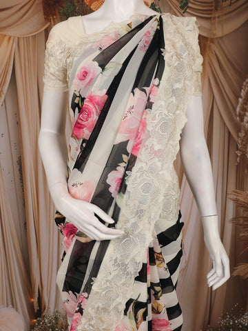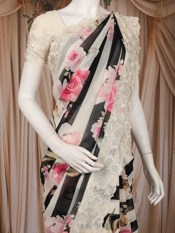 Ivory and Black Striped Floral Printed Chiffon Saree with Scallop Lace Edge Border