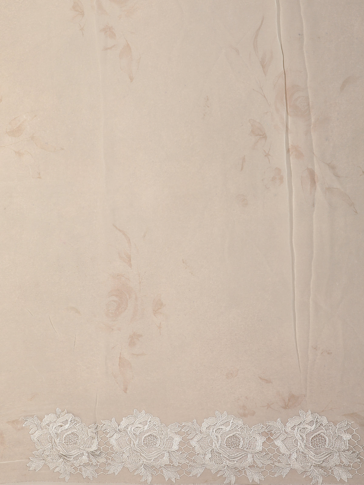Finishing the saree is a delicate scallop lace edge border, lending a refined and stylish finish that enhances its overall appeal. It comes paired with a printed black blouse piece featuring artistic floral motifs, allowing for both classic and trendy blouse styling options.
