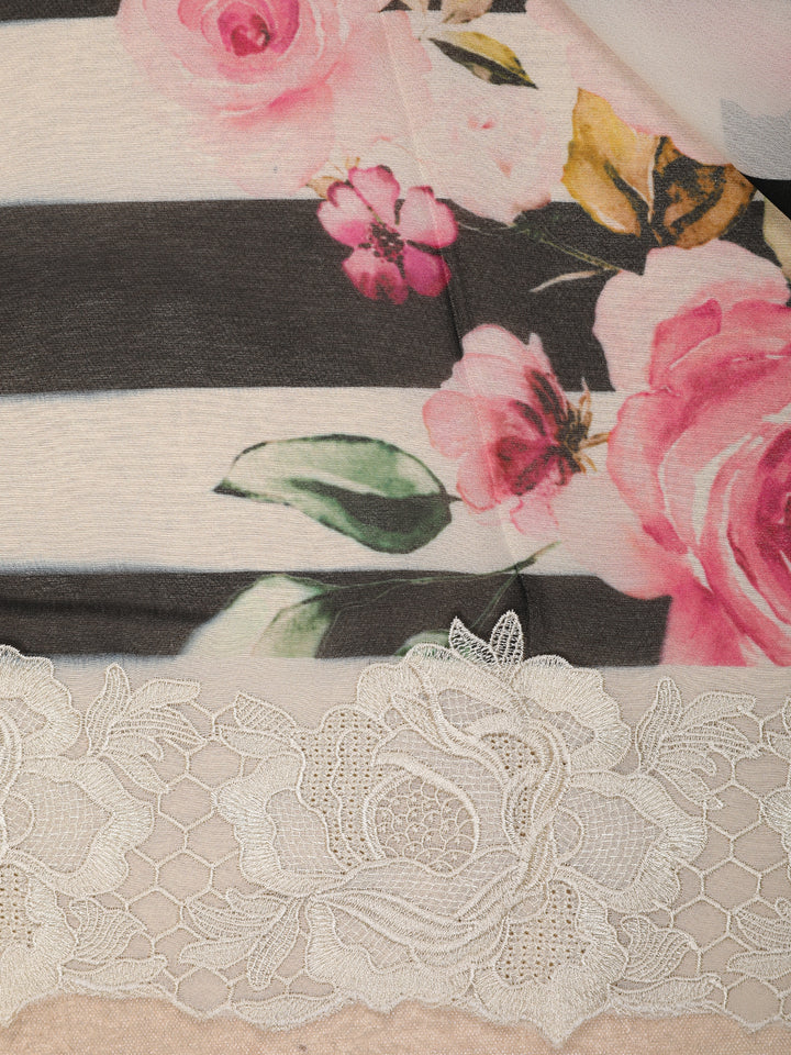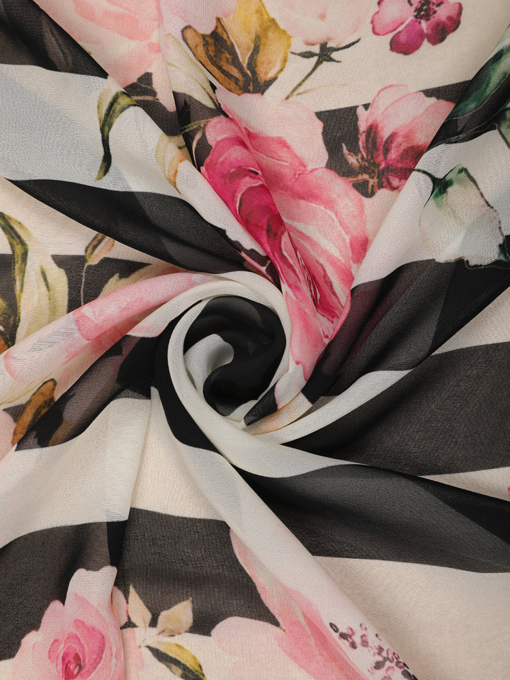 Elevate your everyday style with this chic Ivory and Black Striped Floral Printed Chiffon Saree, where modern design meets feminine elegance. The saree features a contemporary striped pattern in monochrome shades, beautifully complemented by soft pink rose floral motifs placed tastefully across the drape for a romantic touch.