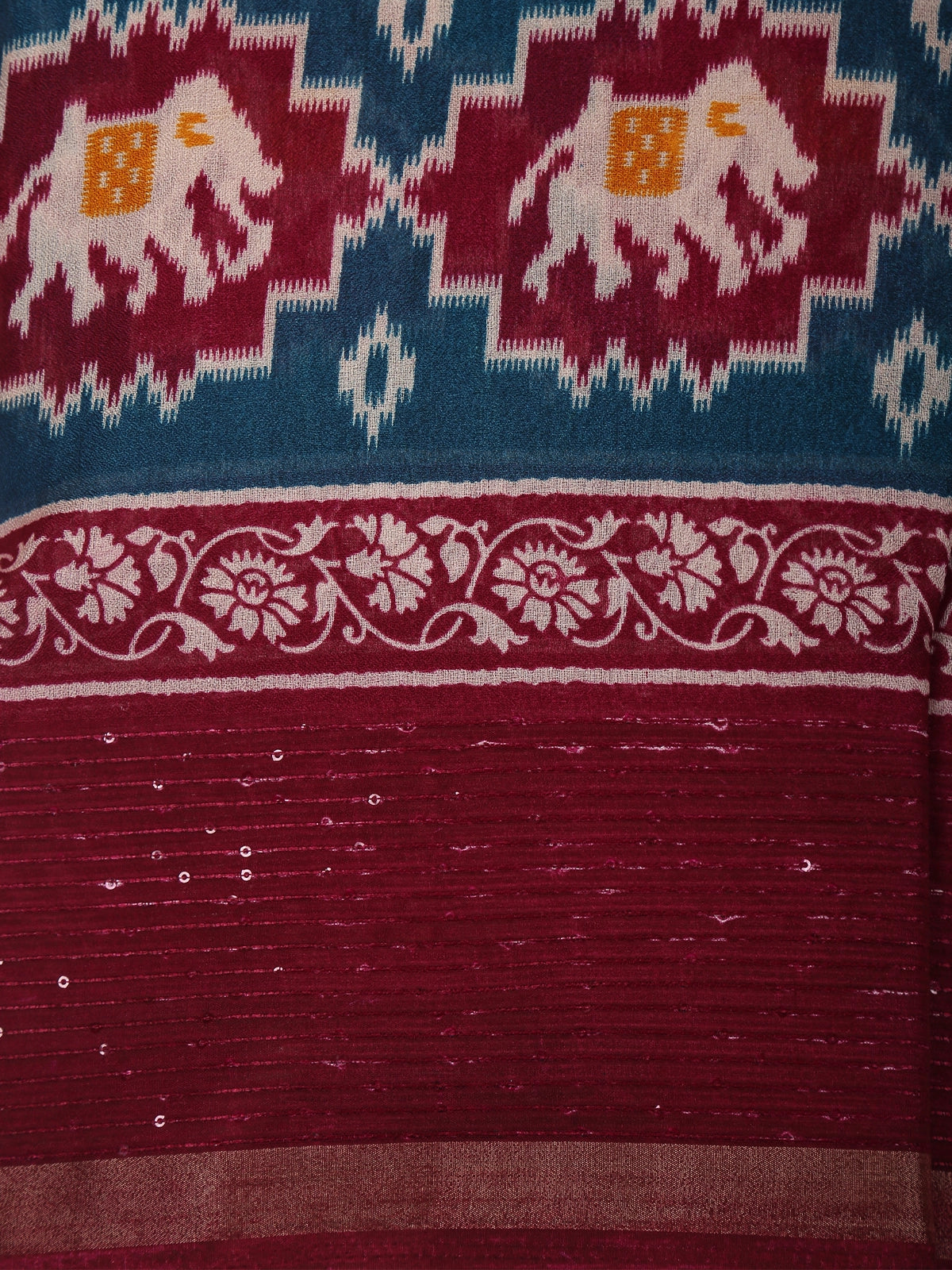 The highlight of the saree is the bold Ikat-inspired border panel featuring stylized elephant motifs woven in vibrant red, black, and ivory tones. These geometric elephant patterns are framed within traditional Ikat-style shapes, adding a beautiful tribal-inspired character to the design.