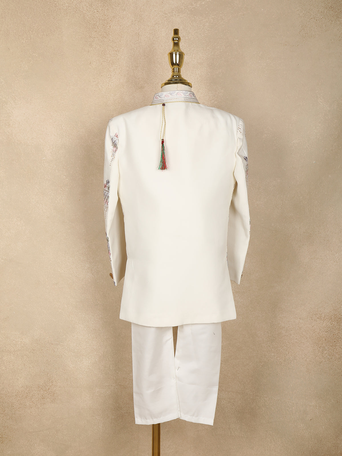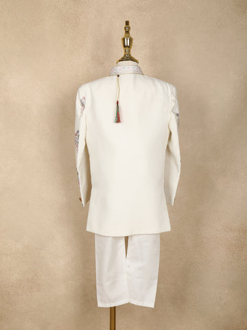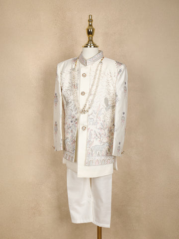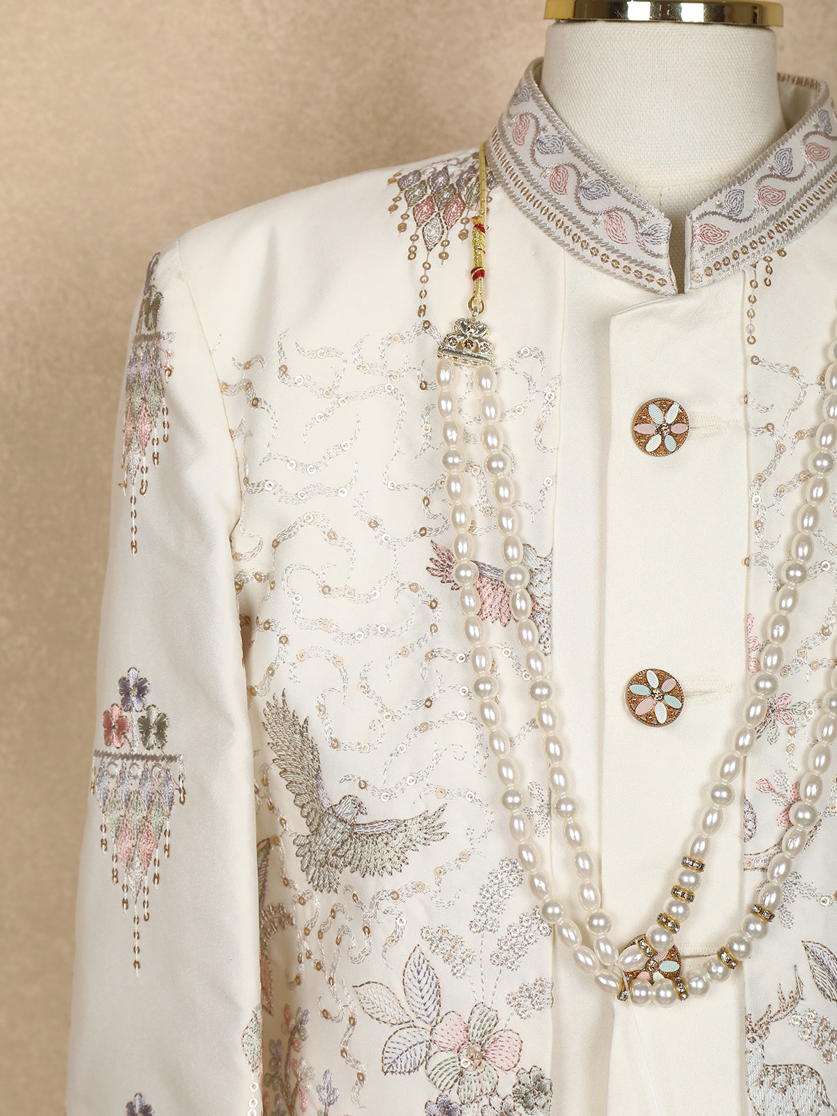 Ivory Floral and Birds Embroidered Kids Semi Silk Sherwani Set