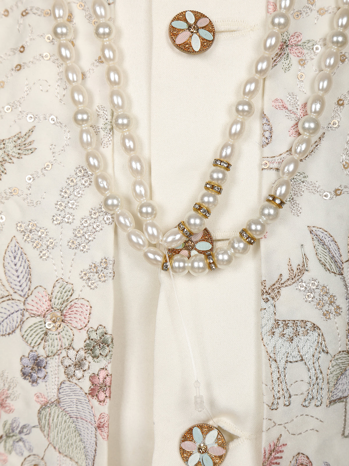 Dress your little prince in refined elegance with this ivory embroidered sherwani set. The jacket features intricate pastel thread embroidery inspired by nature, showcasing birds, florals, and majestic deer motifs. Decorative buttons and a dual-layered pearl mala accent add a regal touch, perfect for festive and traditional celebrations. The mandarin collar with delicate woven detailing enhances its royal appeal. Paired with matching trousers, this ensemble offers comfort while making a bold and charming style statement at weddings, festive functions, and special occasions.