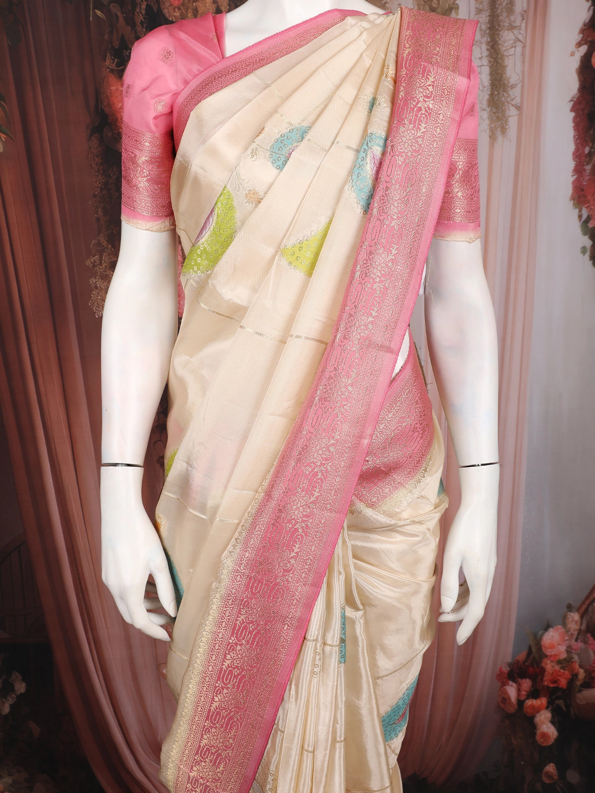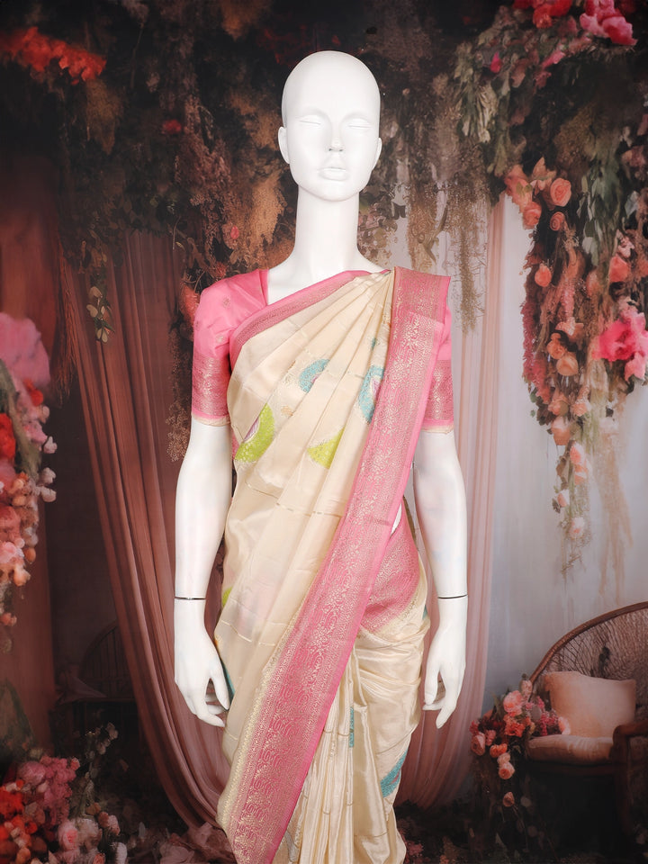 Ivory Floral and Leaf Woven Banarasi Silk Saree with Contrast Pink Zari Border