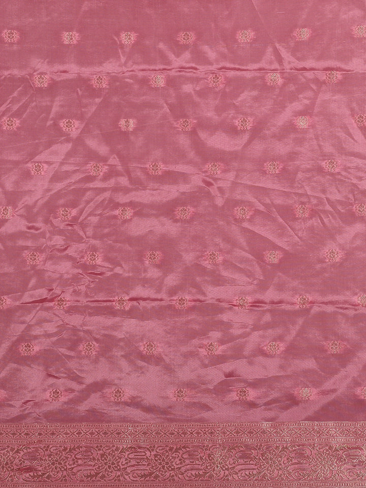 Paired with a matching pink blouse featuring woven buttas and zari detailing, this saree is a statement of sophistication—ideal for wedding functions, festive occasions, and cultural celebrations.