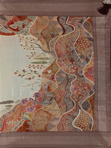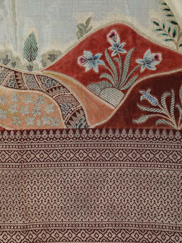 Drape yourself in timeless elegance with this Ivory Floral Embroidered Banarasi Silk Saree, a masterpiece of artistry and luxury. Crafted from rich Banarasi silk, the saree features a graceful ivory body adorned with delicate floral embroidery, adding a subtle sheen and regal sophistication.