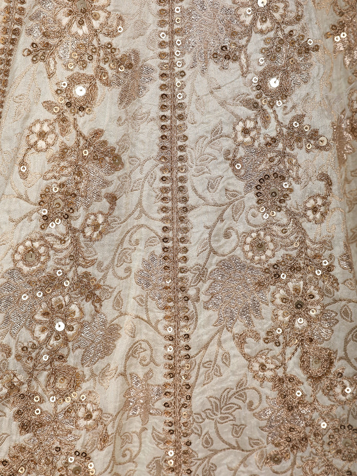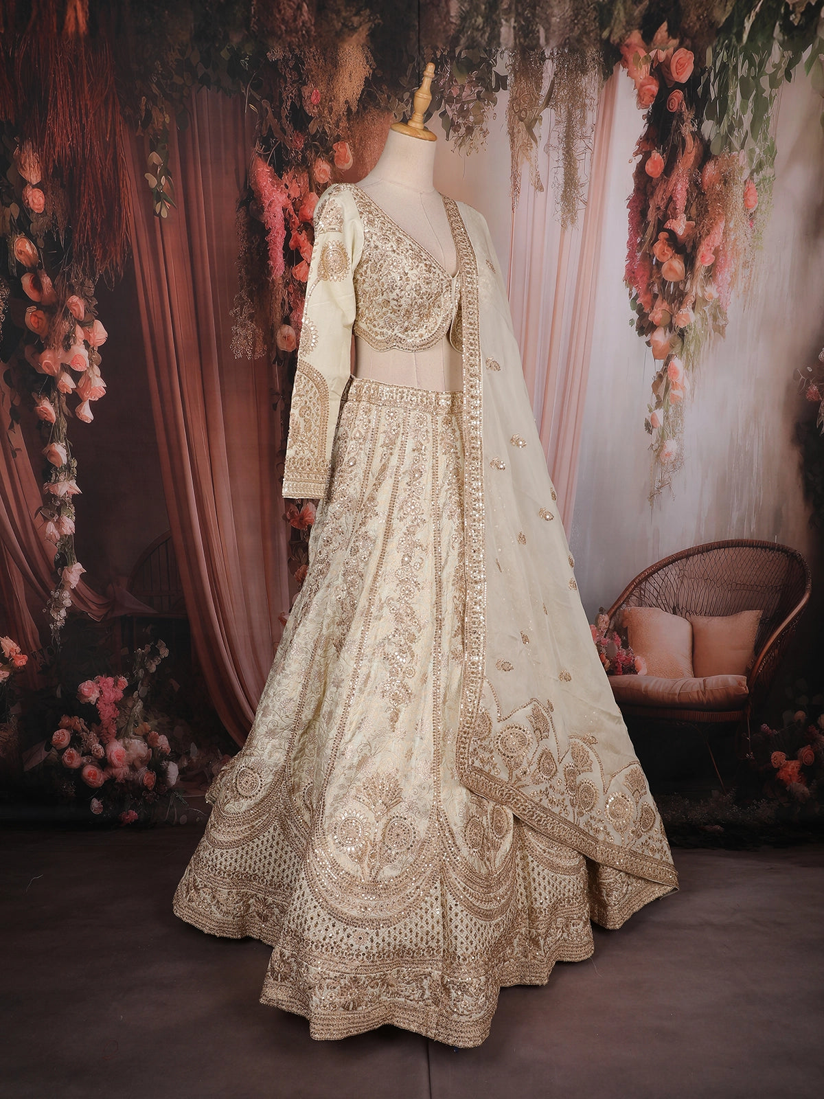 A vision of grace and grandeur, this ivory bridal lehenga is adorned with intricate floral embroidery highlighted with gold zari and sequin detailing. The Raw Silk blouse features a deep V-neckline that adds a refined modern touch, paired with full sleeves richly embroidered to elevate the regal charm.