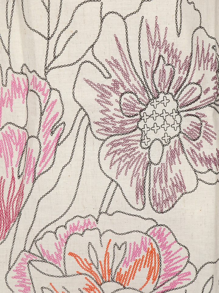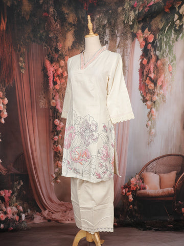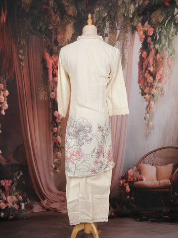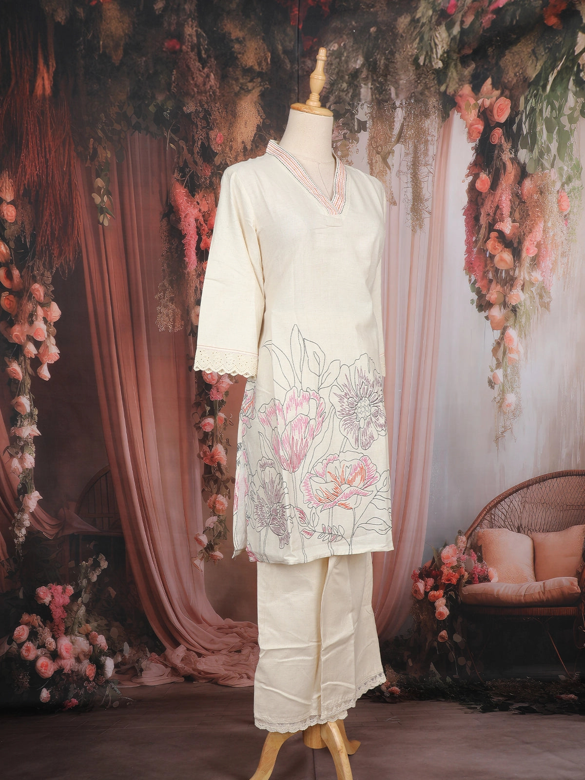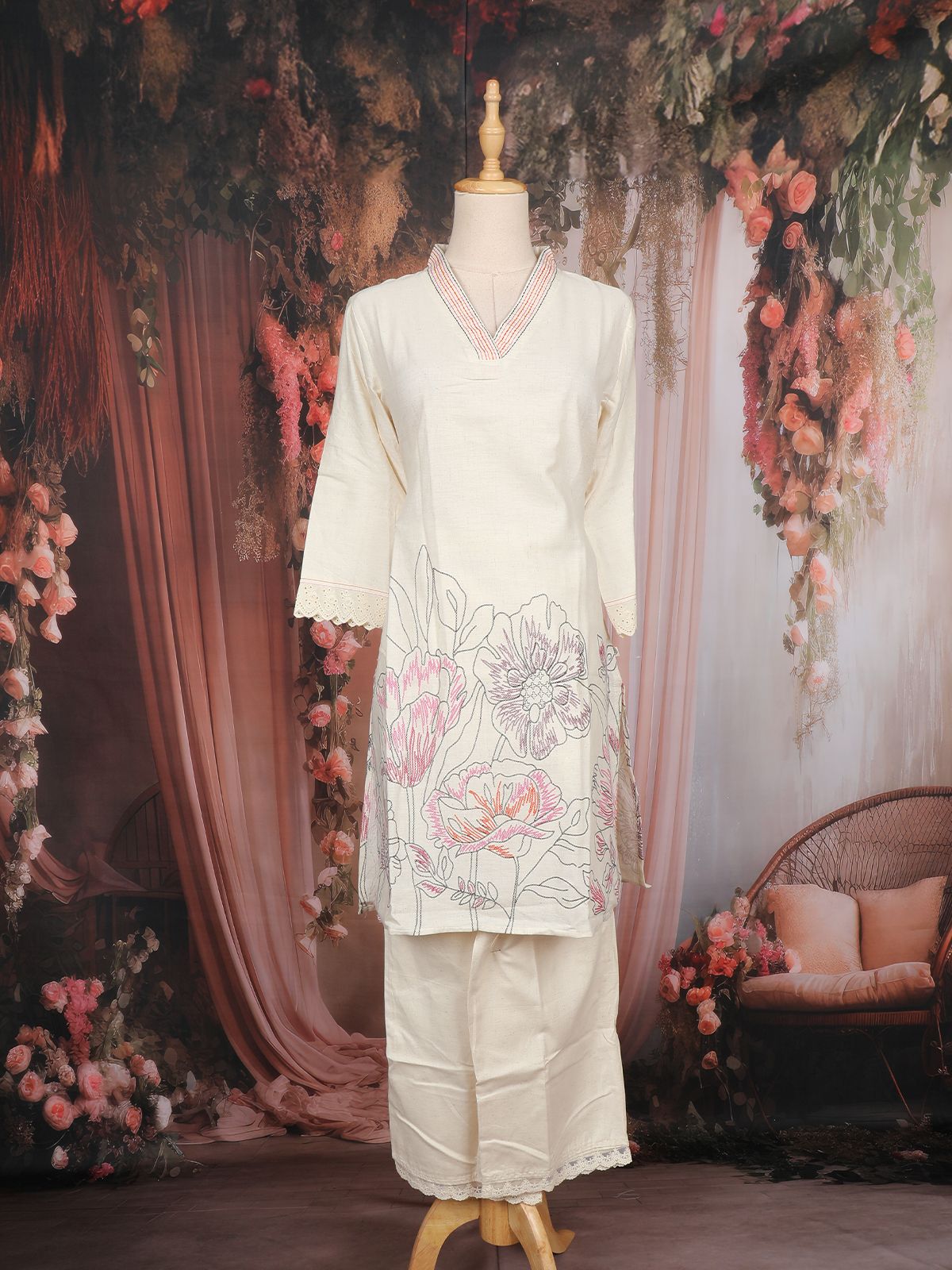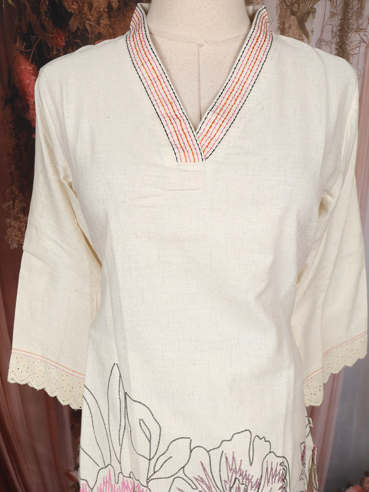 Embrace elegance in simplicity with this Ivory Floral Thread Embroidered Cotton Kurti. Crafted from premium cotton fabric, this piece features intricate floral embroidery in soft hues of pink, orange, and lilac that lends it an artistic charm. The kurti is styled with a V-shaped neckline accentuated by multicolored thread detailing and 3/4 sleeves finished with delicate lace borders. Perfect for casual gatherings or day outings, this kurti combines comfort with a subtle touch of sophistication.