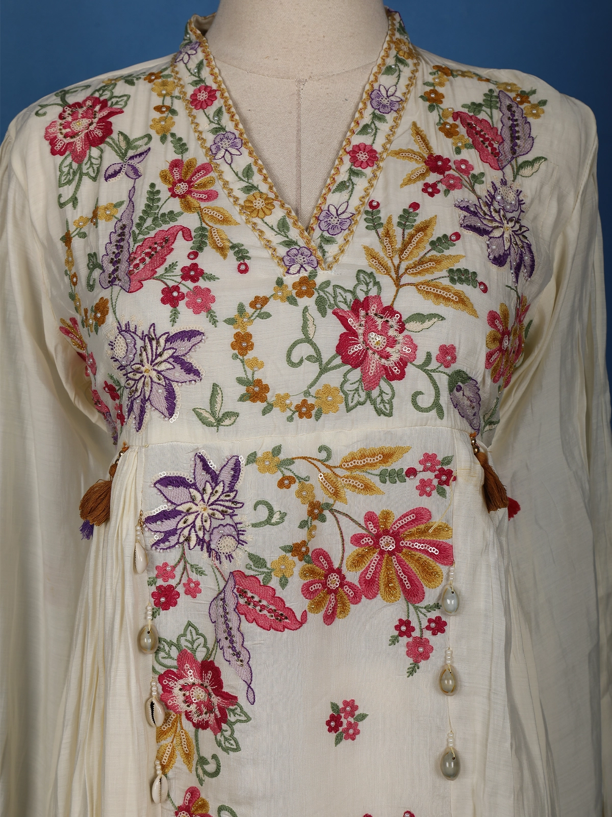 The charming floral design is beautifully enhanced with fine embroidery work, adding subtle shimmer and texture to the ensemble. Its straight-cut silhouette lends a touch of contemporary elegance, making it perfect for festive gatherings, casual celebrations, or semi-formal events.