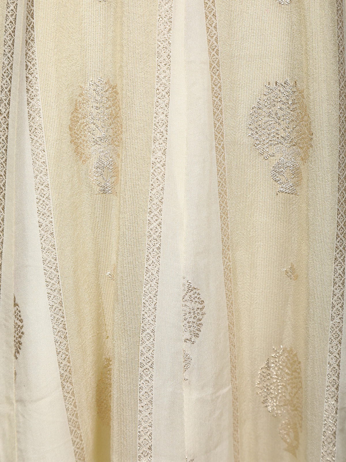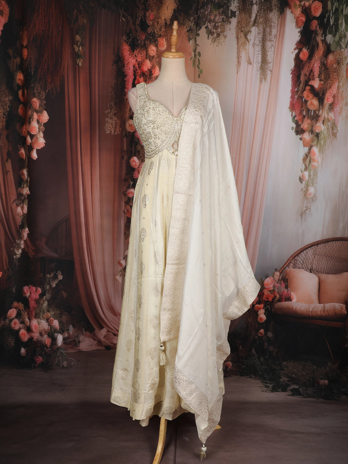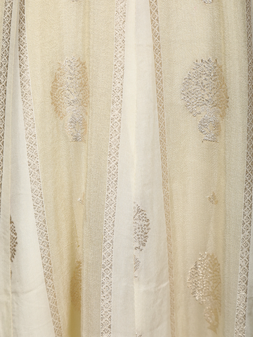 The flowing Anarkali skirt showcases delicate woven motifs, lending a soft shimmer and graceful movement with every step. Complementing the ensemble is a sheer matching dupatta adorned with a subtle zari border, adding an ethereal finish to the look.