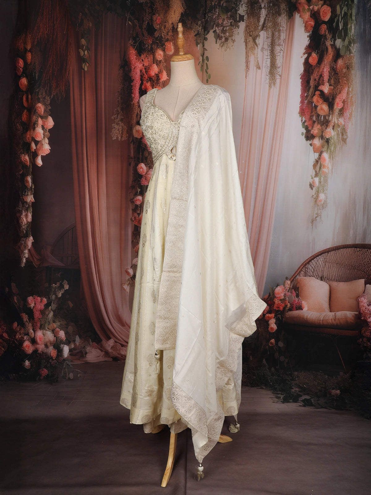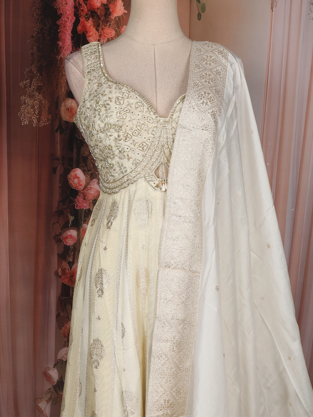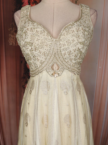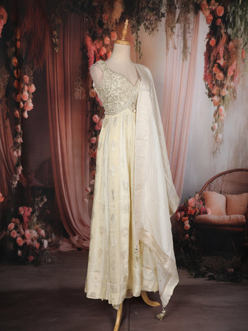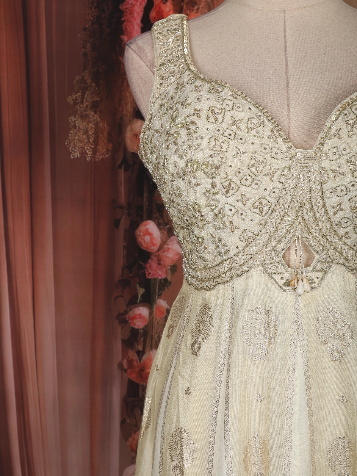 Elevate your festive elegance with this exquisite Ivory Tissue Silk Anarkali Suit, crafted to reflect timeless grace and refined luxury. The sleeveless bodice features intricate floral embroidery enriched with sequins and zari work, beautifully highlighted by a flattering sweetheart neckline that adds a contemporary touch to the traditional silhouette.