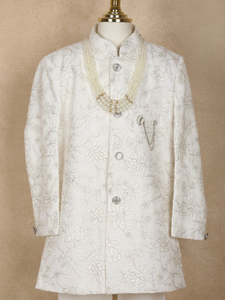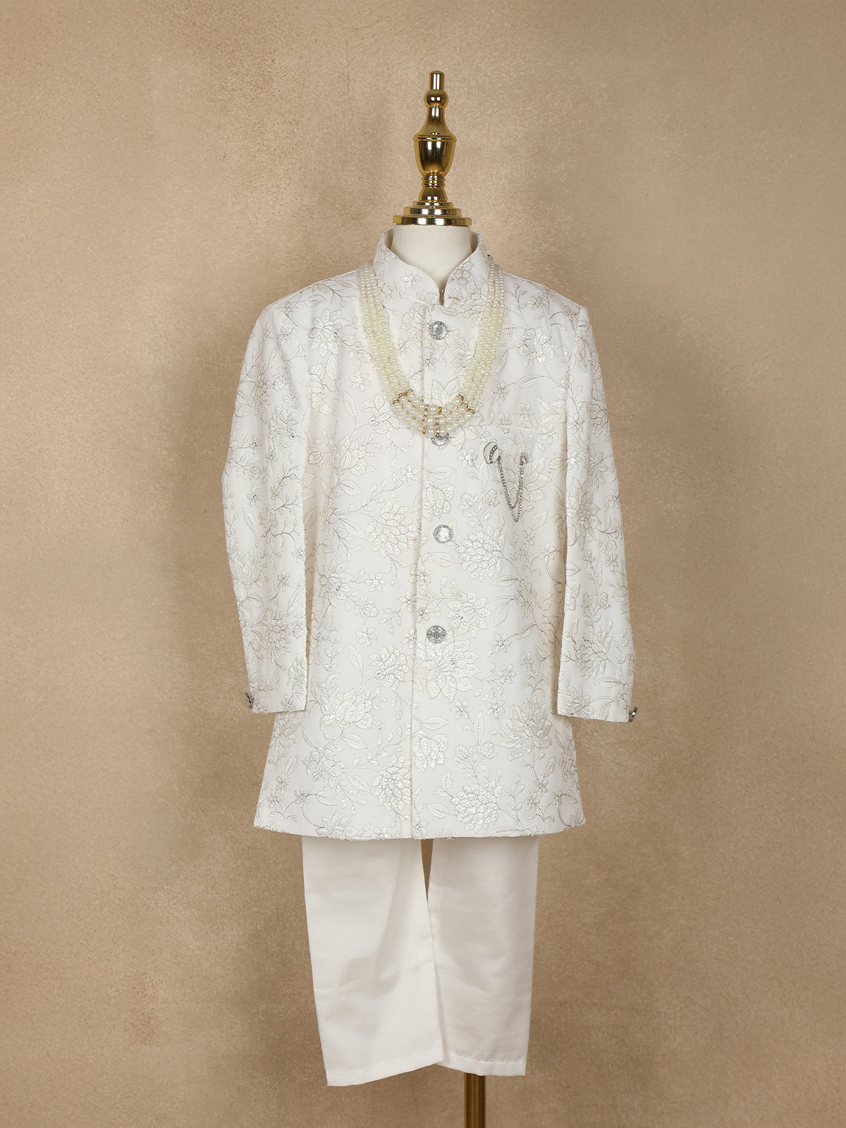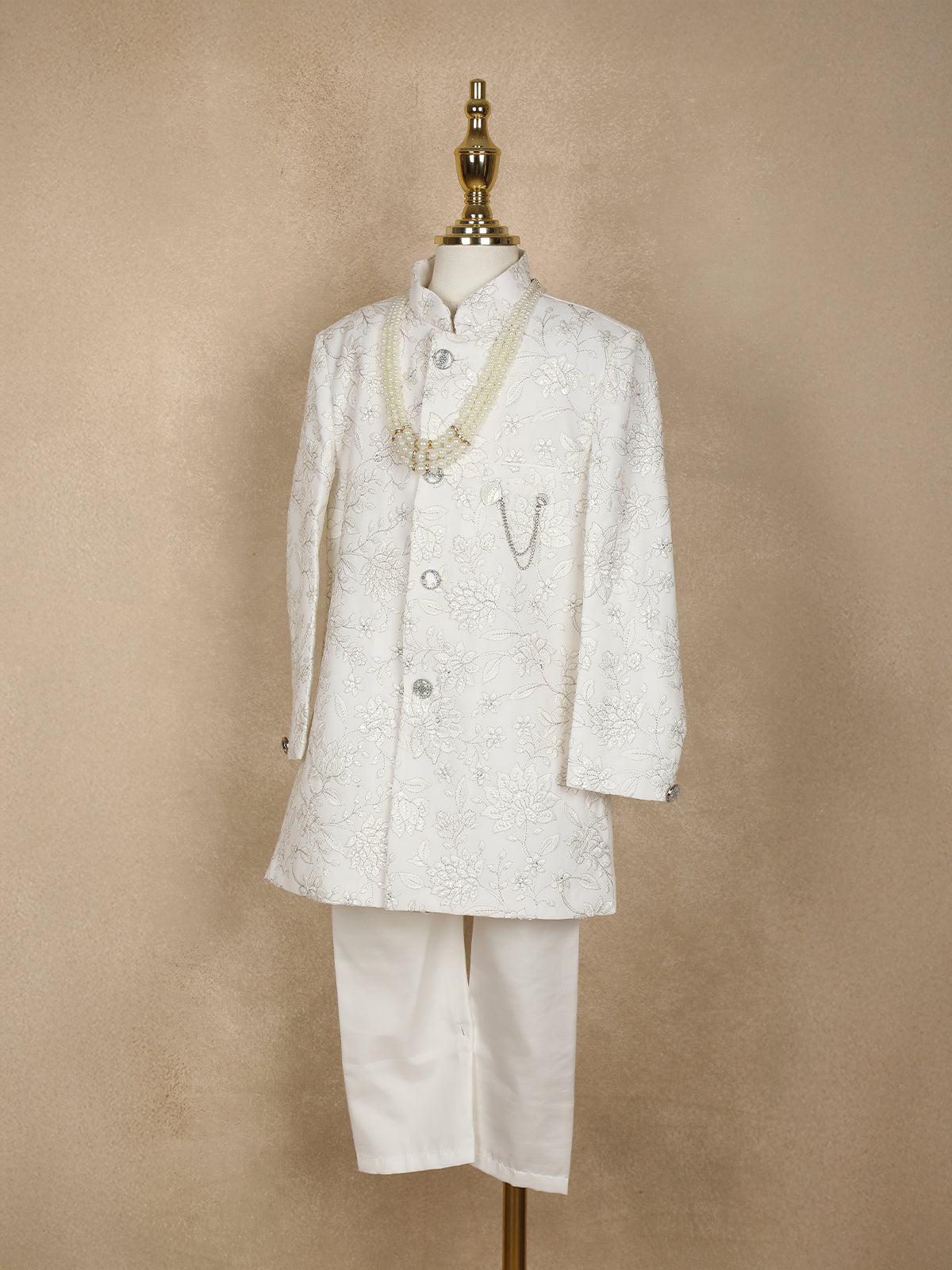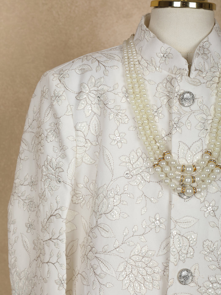 Ivory Floral Embroidered Kids Georgette Sherwani Set
