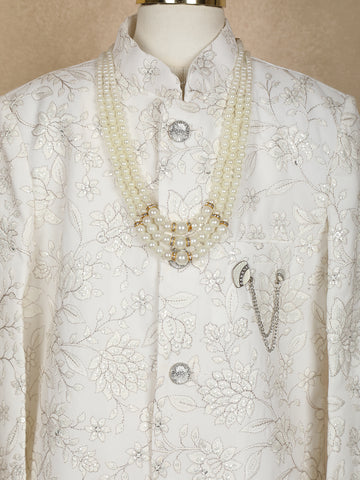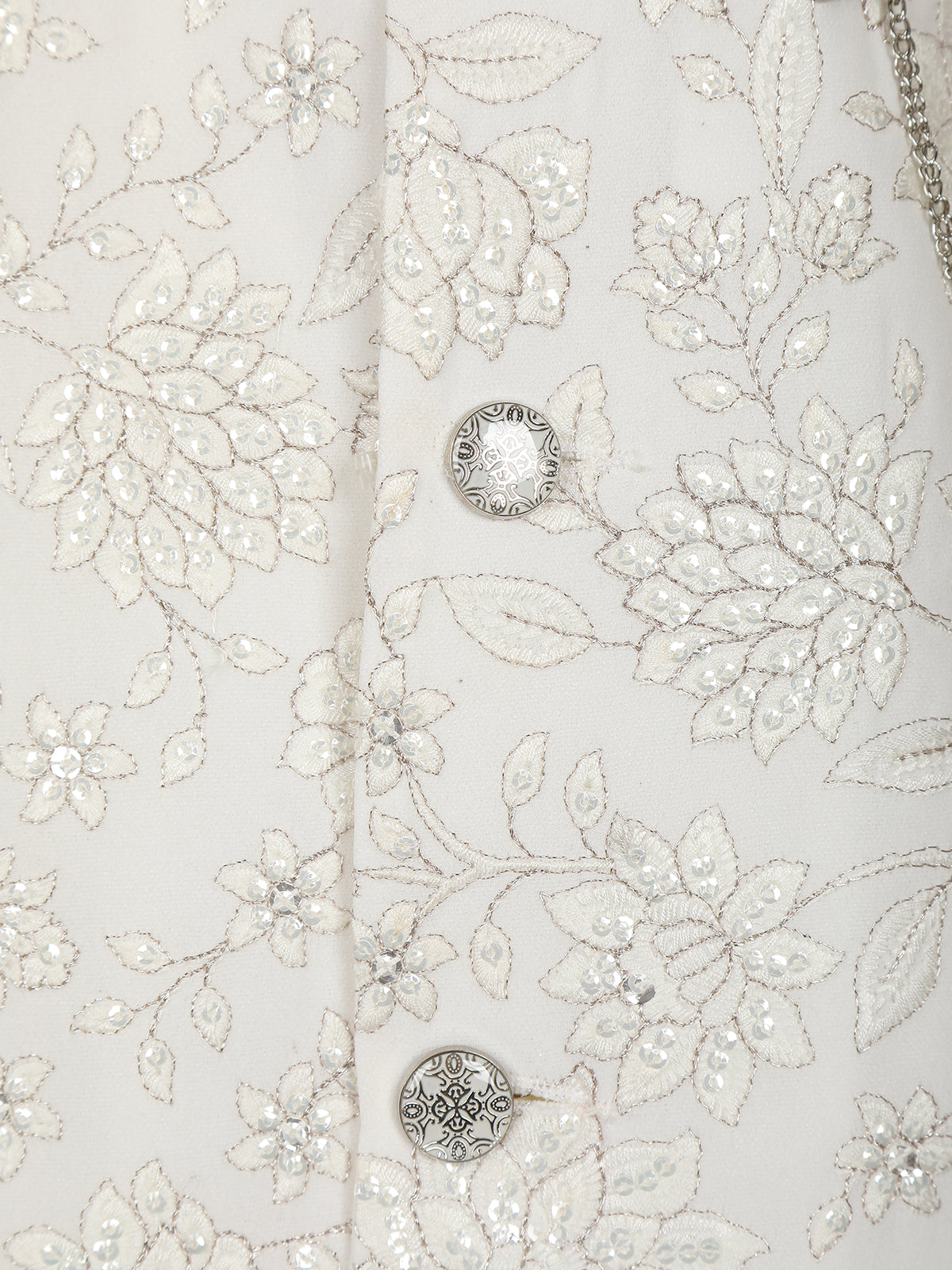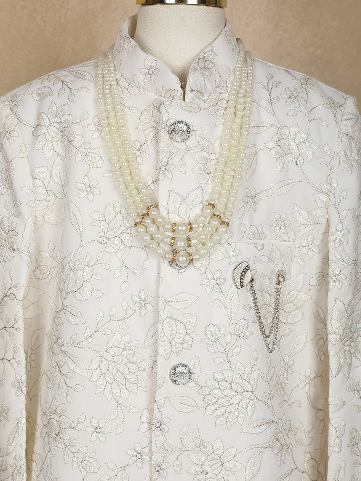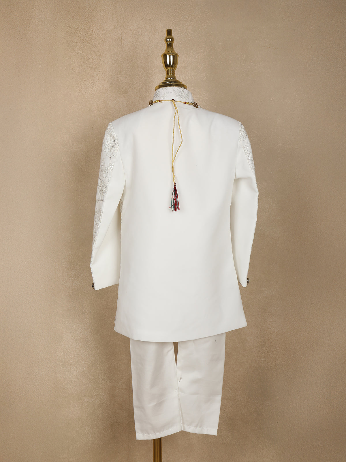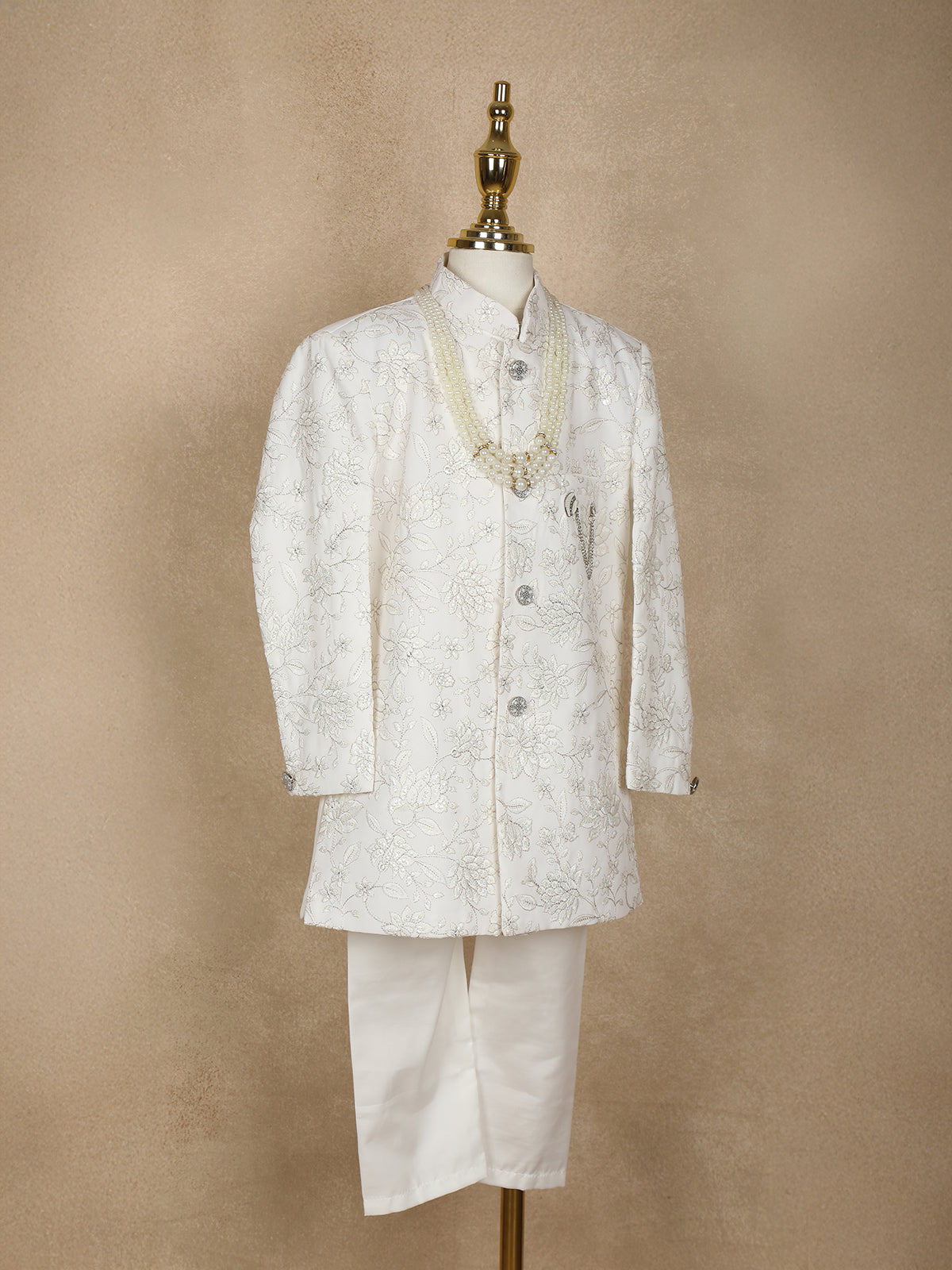 Ivory Floral Embroidered Kids Georgette Sherwani Set