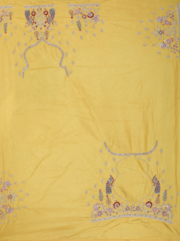 Paired with a matching designer blouse in mustard yellow, embroidered with heavy floral and peacock motifs on the sleeves and neckline, this ensemble offers a perfect blend of tradition and luxury. The blouse comes unstitched, allowing custom tailoring to your preferred fit and style.
