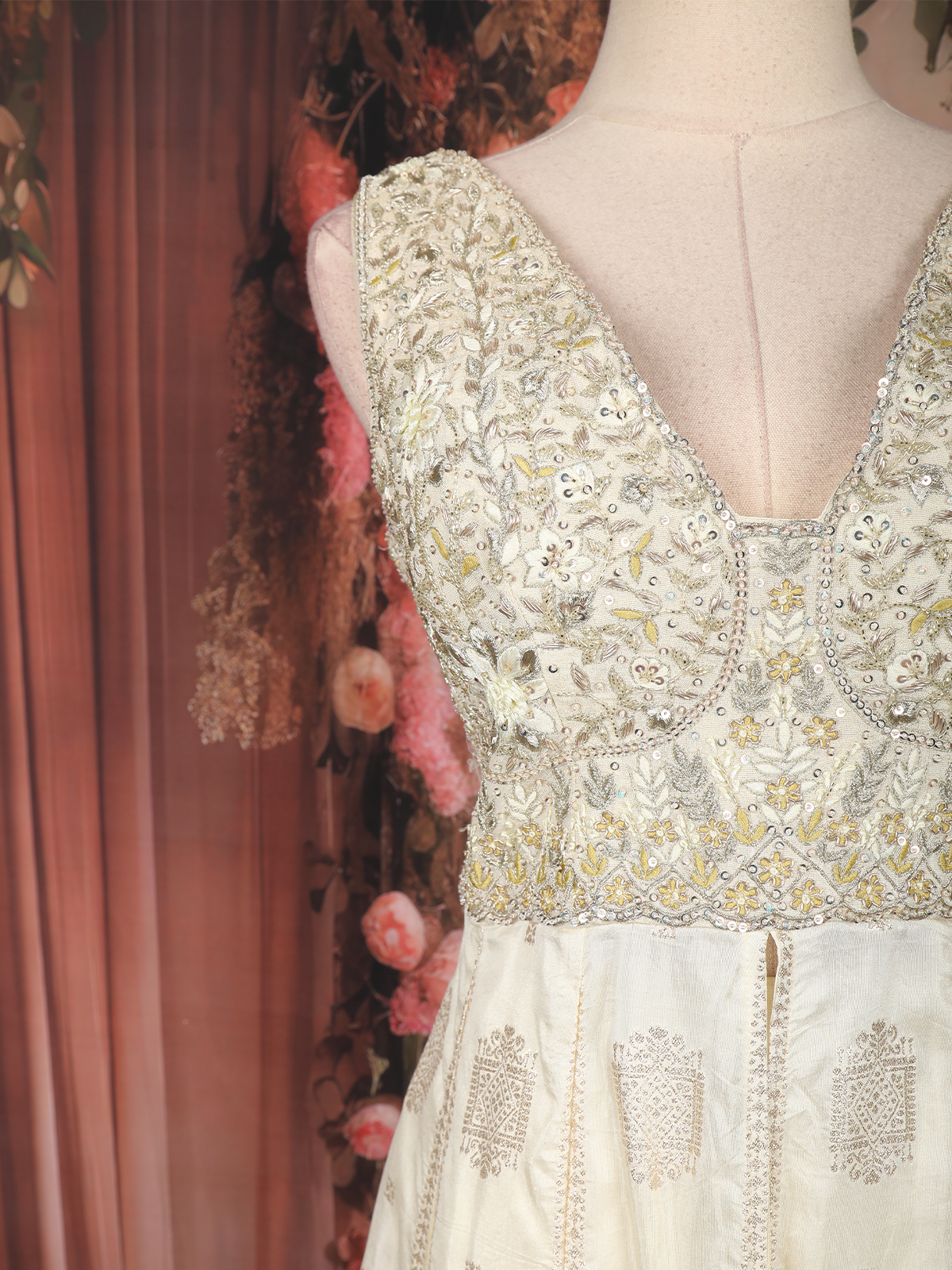 Elevate your festive wardrobe with this elegant Ivory Tissue Silk Palazzo Suit, crafted to reflect soft luxury and refined craftsmanship. The sleeveless kurta features intricate floral embroidery enhanced with delicate sequins and bead detailing, creating a graceful shimmer against the pastel base. Designed in premium tissue silk, the kurta flows beautifully while offering a flattering, structured silhouette.