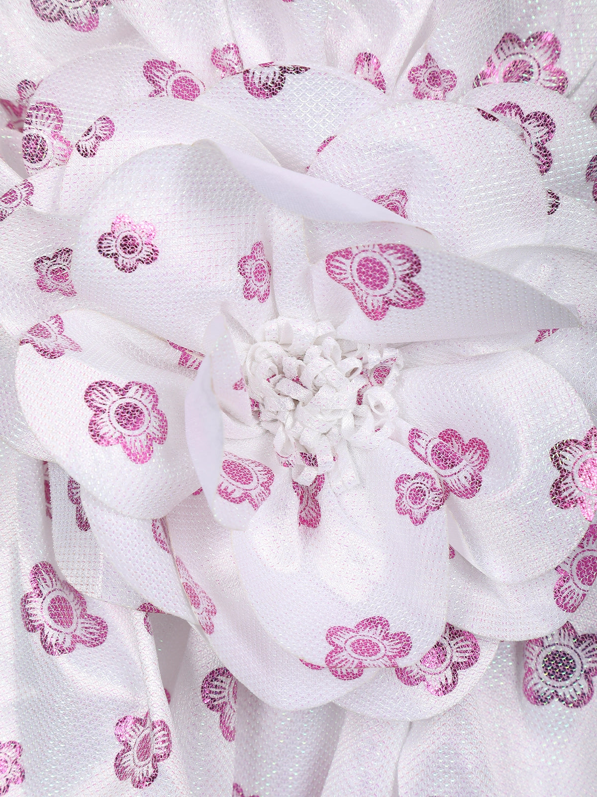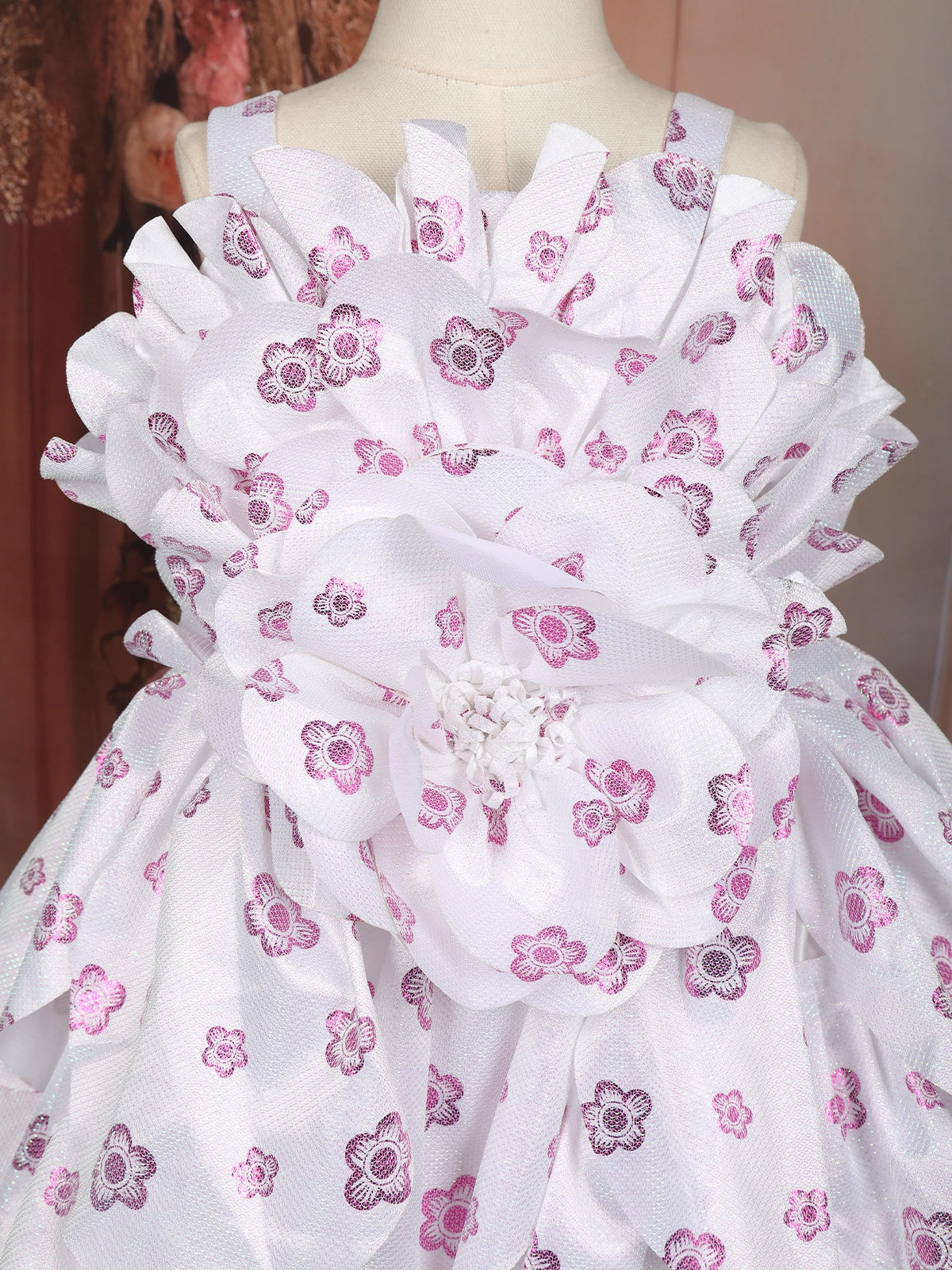 The frock is beautifully styled with multiple layered petal-cut panels, creating a voluminous and flowy silhouette that looks enchanting with every twirl. The highlight of the design is the oversized 3D floral applique at the waist, which enhances the dress with a statement, couture-inspired finish.