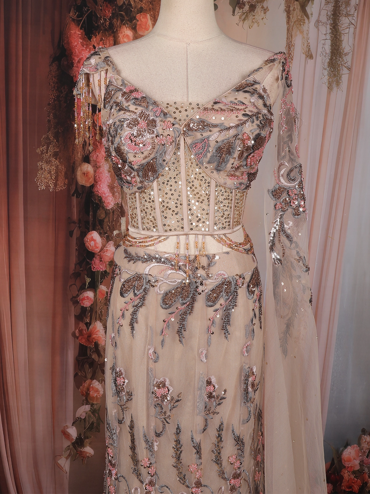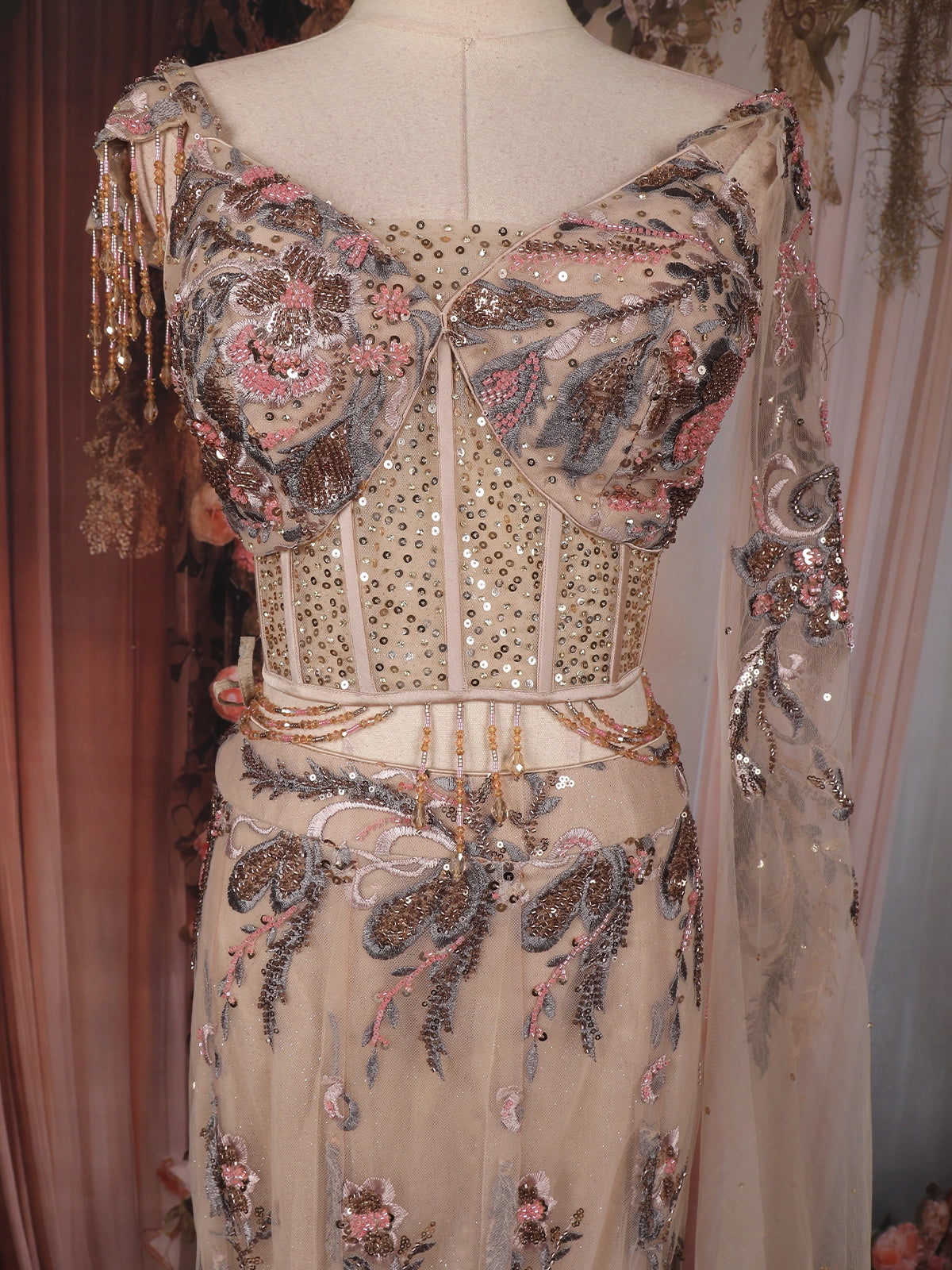 This ivory mermaid net lehenga is a stunning expression of refined bridal elegance, crafted to leave a lasting impression at special occasions. Designed in delicate net fabric, the ensemble is adorned with intricate floral embroidery enhanced with sequins and bead embellishments, creating a soft shimmer that beautifully complements the graceful ivory tone.