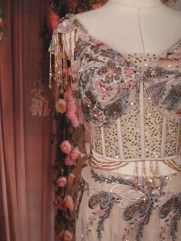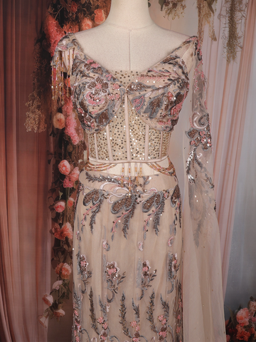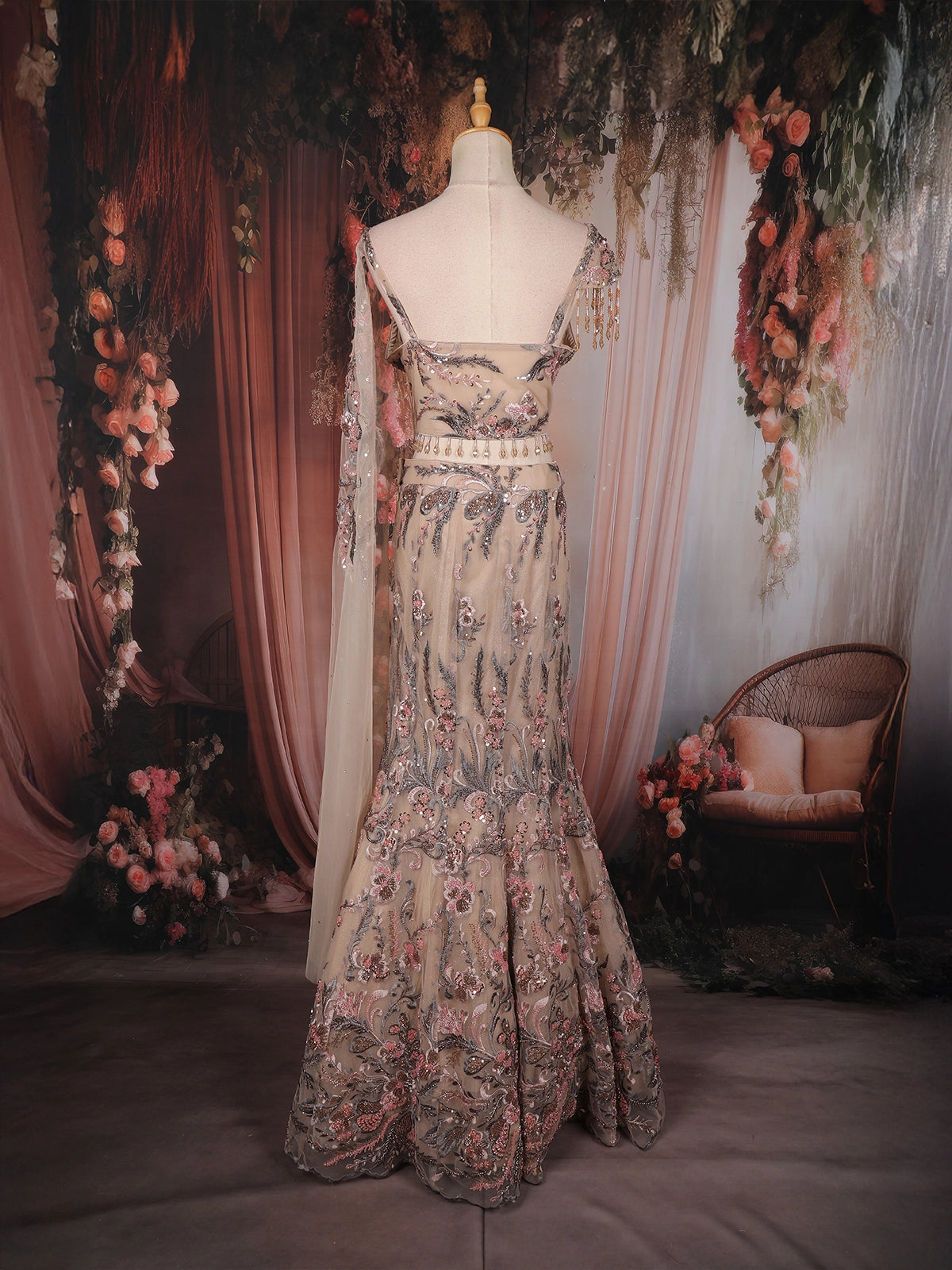 Ivory Floral Sequins and Beads Embroidered Design Mermaid Net Lehenga