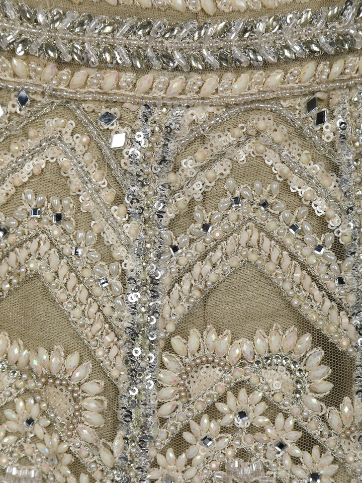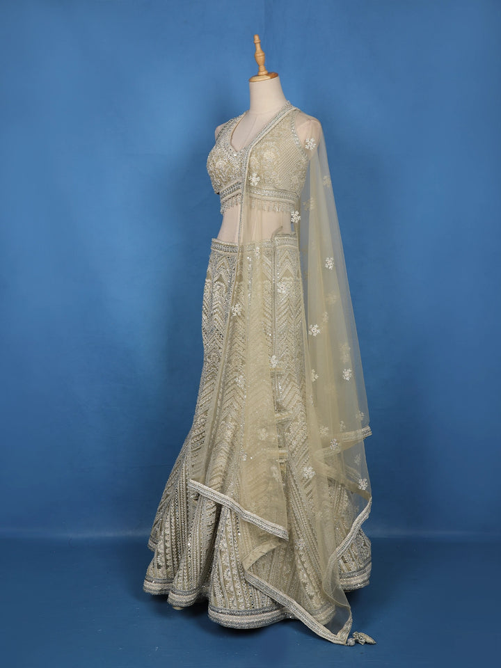 The ensemble is paired with a matching net dupatta embellished with floral embroidered motifs and a sequined border, completing the ethereal look. Perfect for receptions, cocktails, or festive evenings where elegance meets glamour.