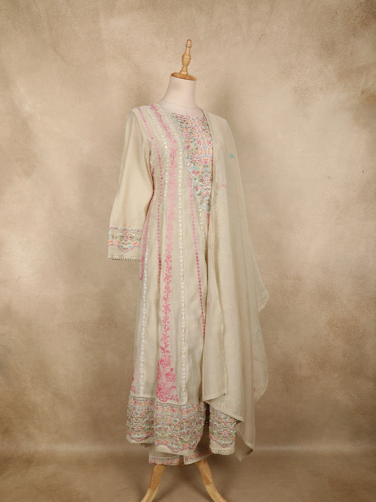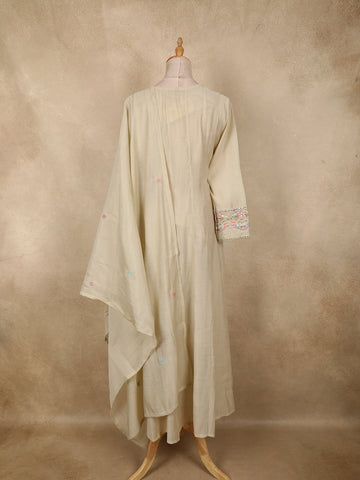 Paired with a coordinated cotton bottom and finished with a matching ivory dupatta accented with subtle embroidered motifs, this ensemble drapes effortlessly. Perfect for festive mornings, casual gatherings, office ethnic days, and summer celebrations, this salwar suit is a versatile addition to any ethnic wardrobe, blending simplicity with refined detailing.