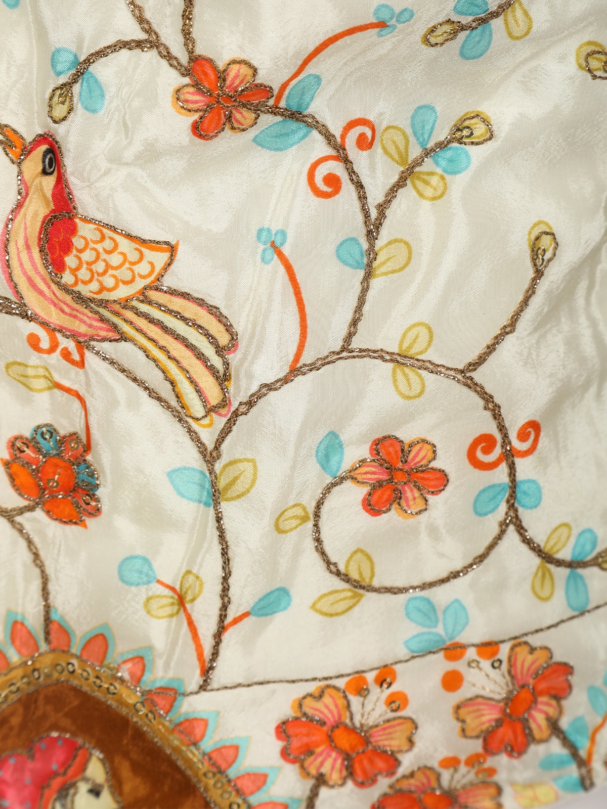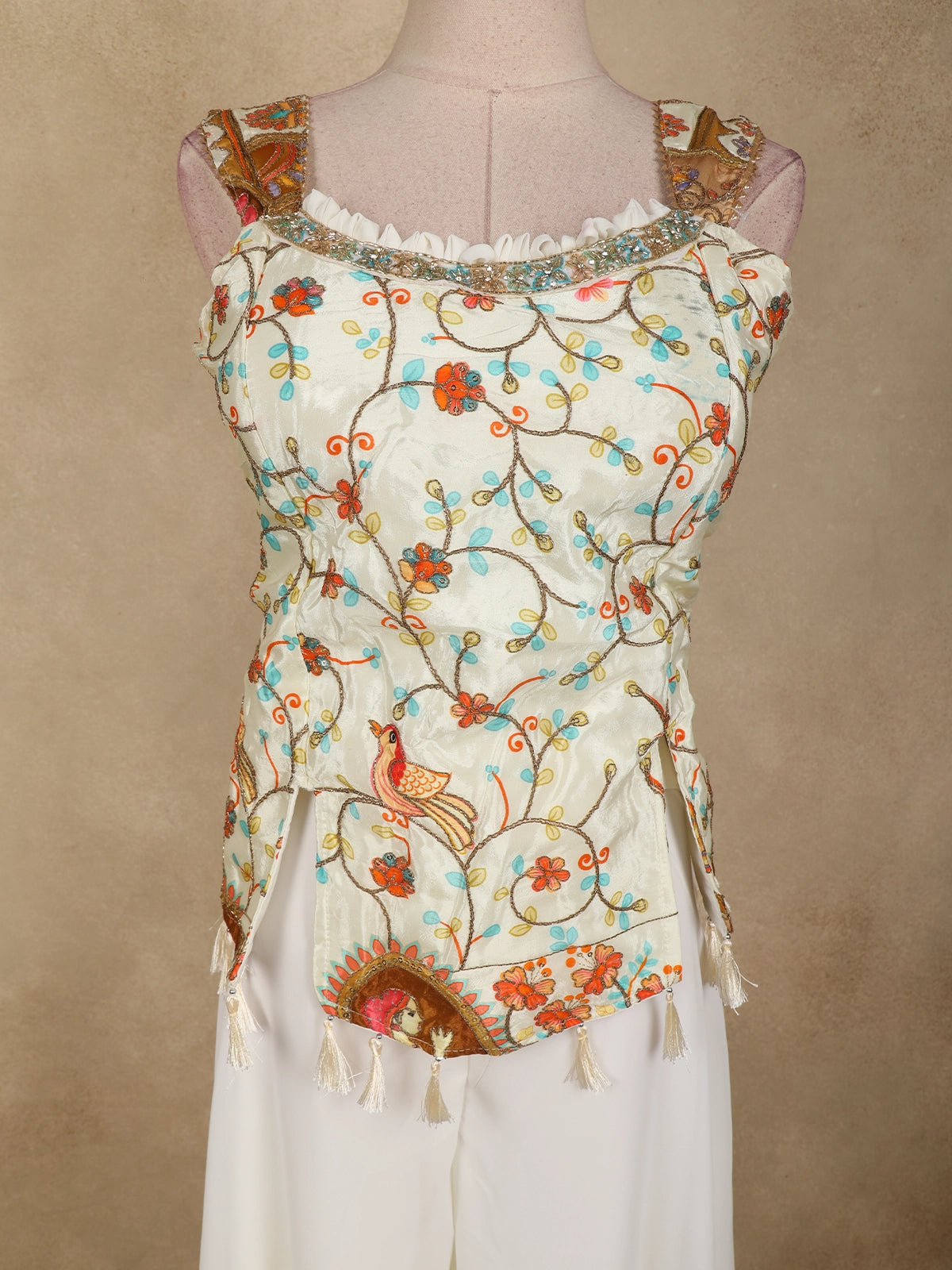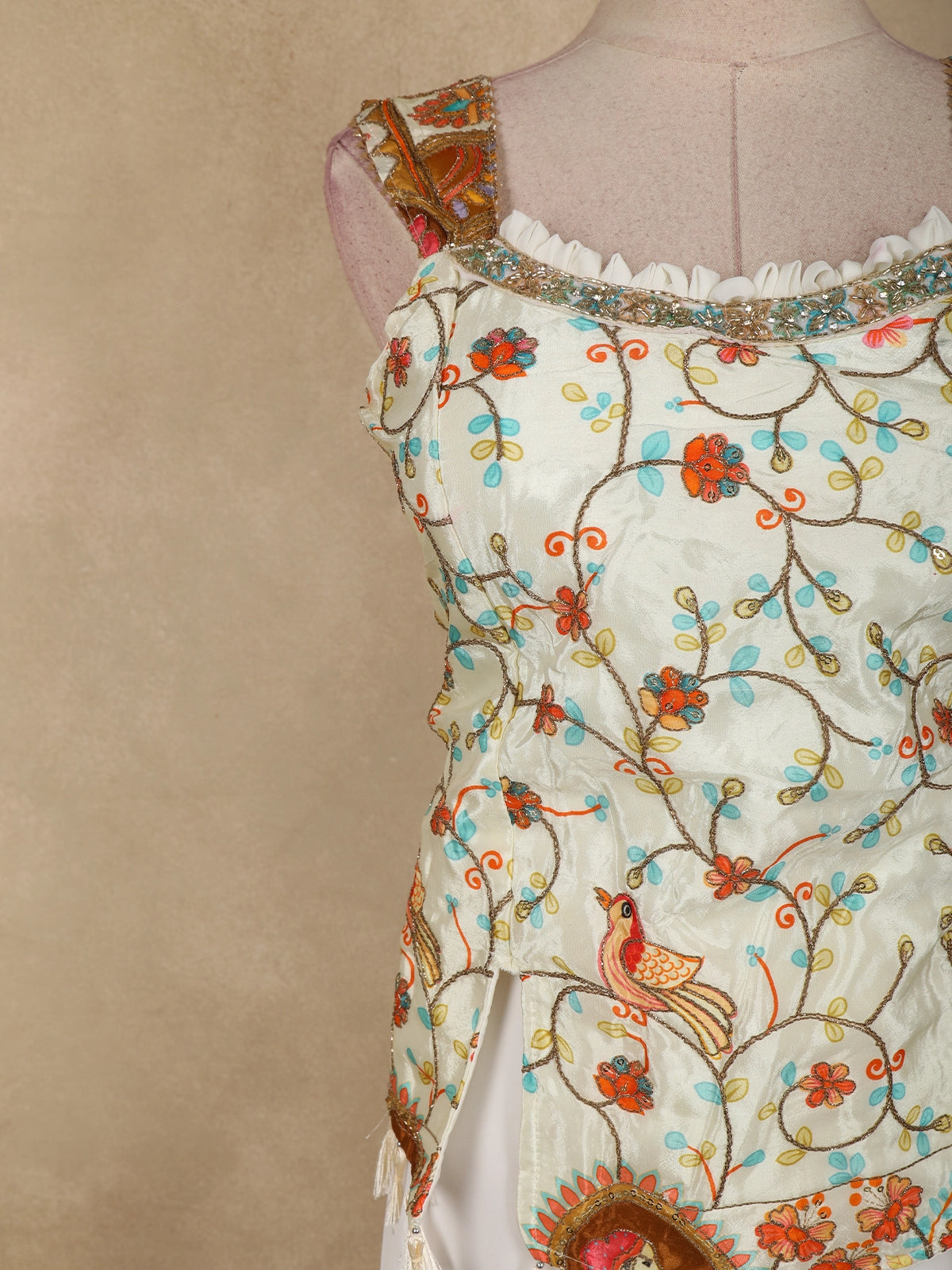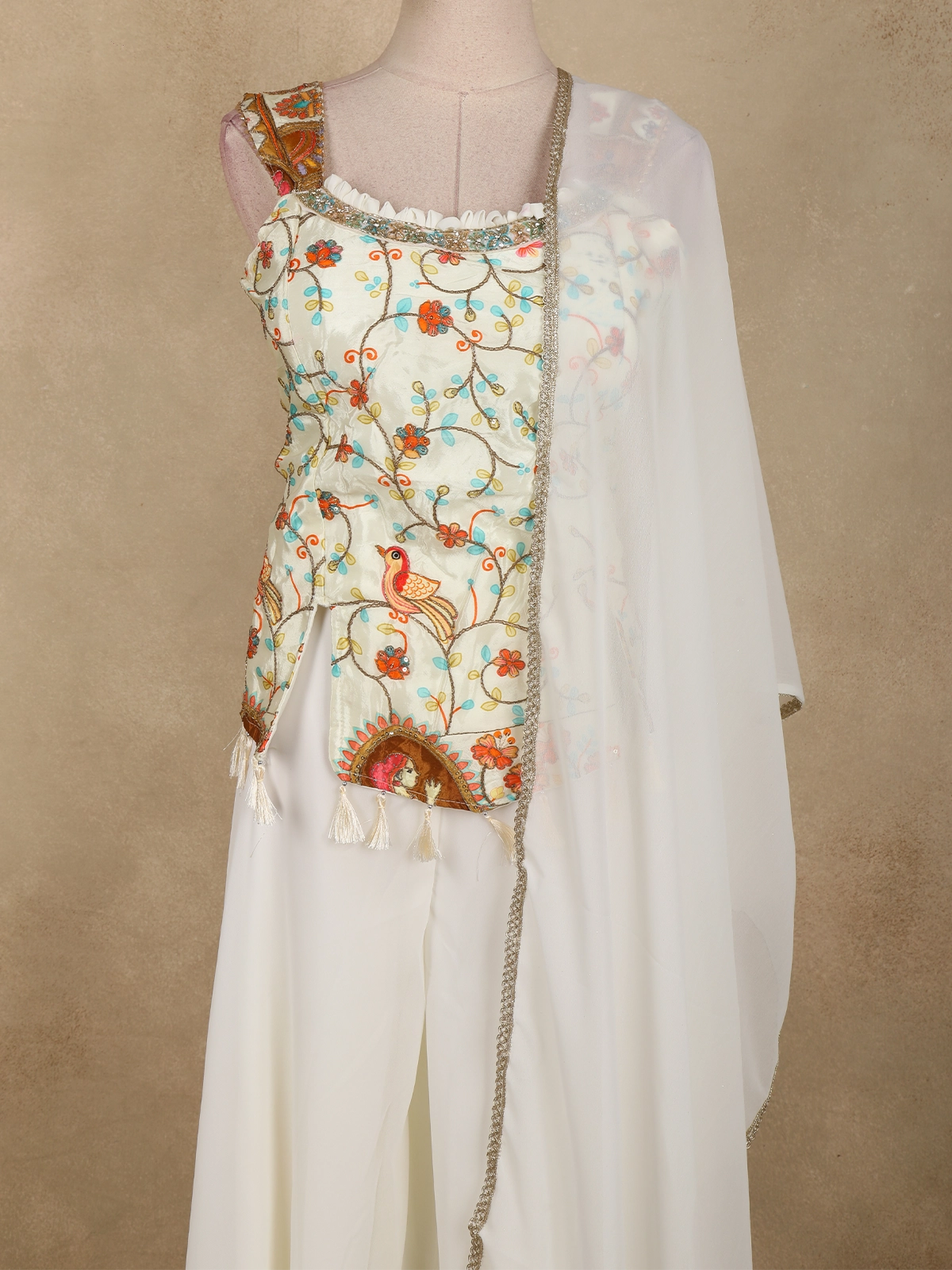 The georgette kurti is adorned with delicate floral thread embroidery, thoughtfully highlighted with multicolour accents that create a lively, handcrafted appeal. The asymmetrical neckline and uniquely detailed front panel add a modern touch, while the soft gathers at the waist enhance the silhouette with a flattering fall. Decorative tassel accents lend a playful yet elegant finish to the design.