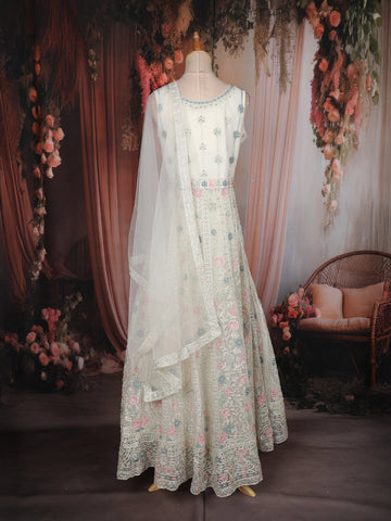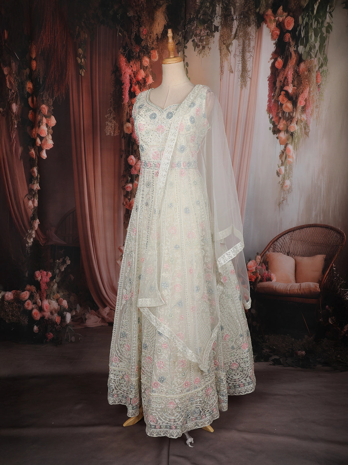 Ivory Floral Thread Embroidery Design Net Engagement Gown with Dupatta