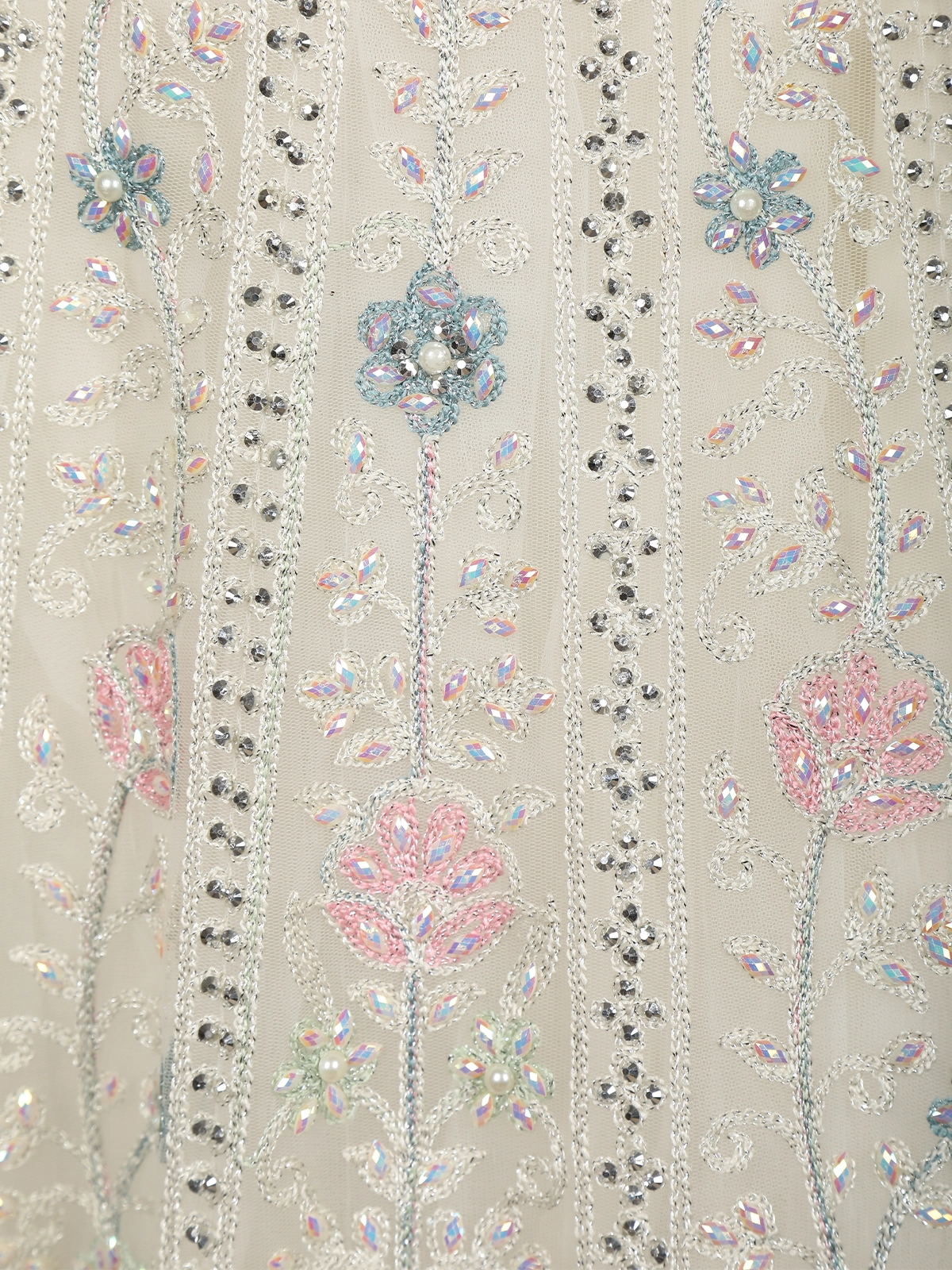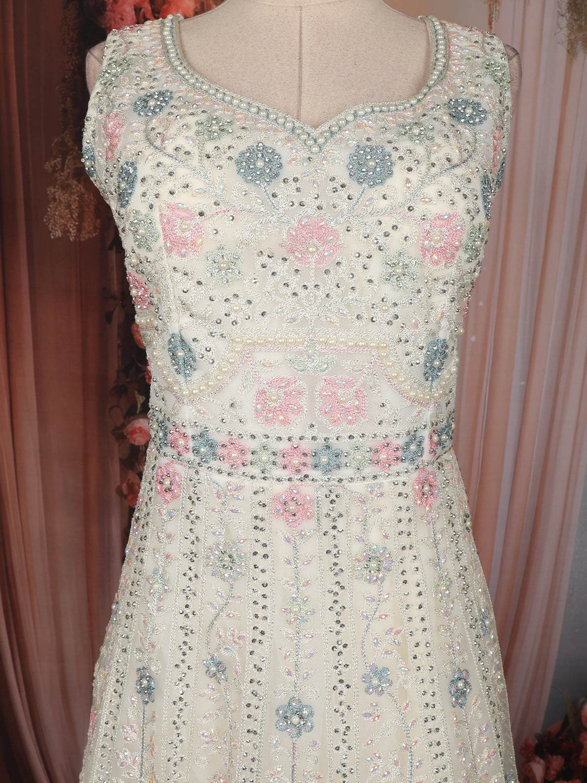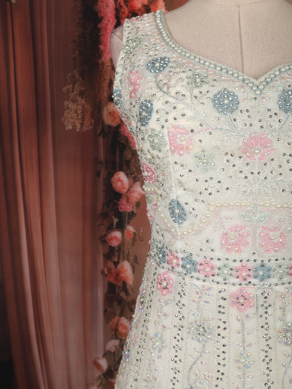The net gown features exquisite floral thread embroidery highlighted with subtle sequins and bead detailing, creating a soft shimmer that adds depth without overpowering the look. The square neckline lends a modern yet elegant touch, while the sleeveless silhouette keeps the design light, graceful, and effortlessly stylish. The fitted bodice flows into a beautifully flared skirt with intricately embroidered panels and a broad ornate hem, offering a flattering and regal silhouette.