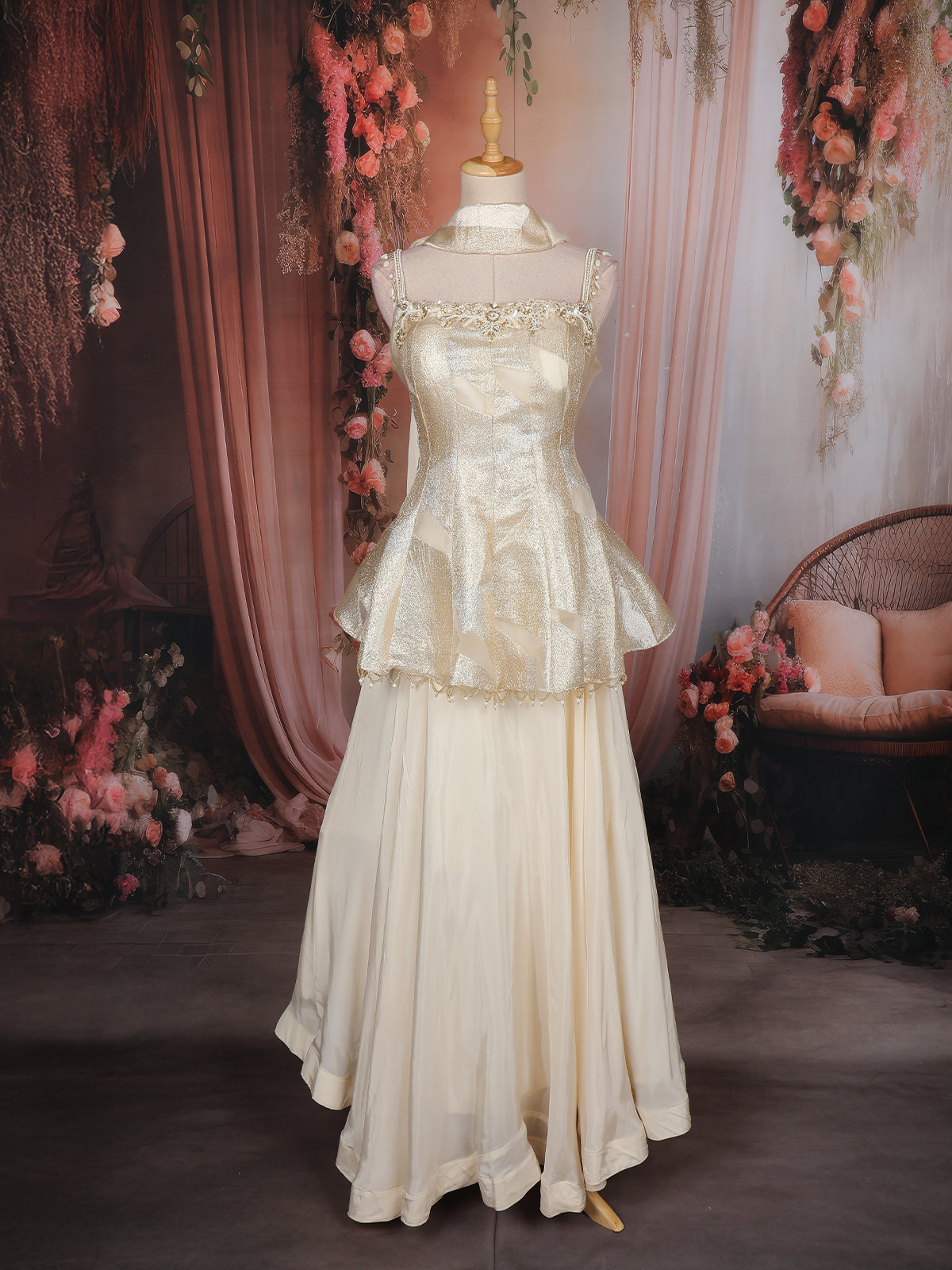 Ivory Gold Floral Embroidered Tissue Peplum Palazzo with Dupatta