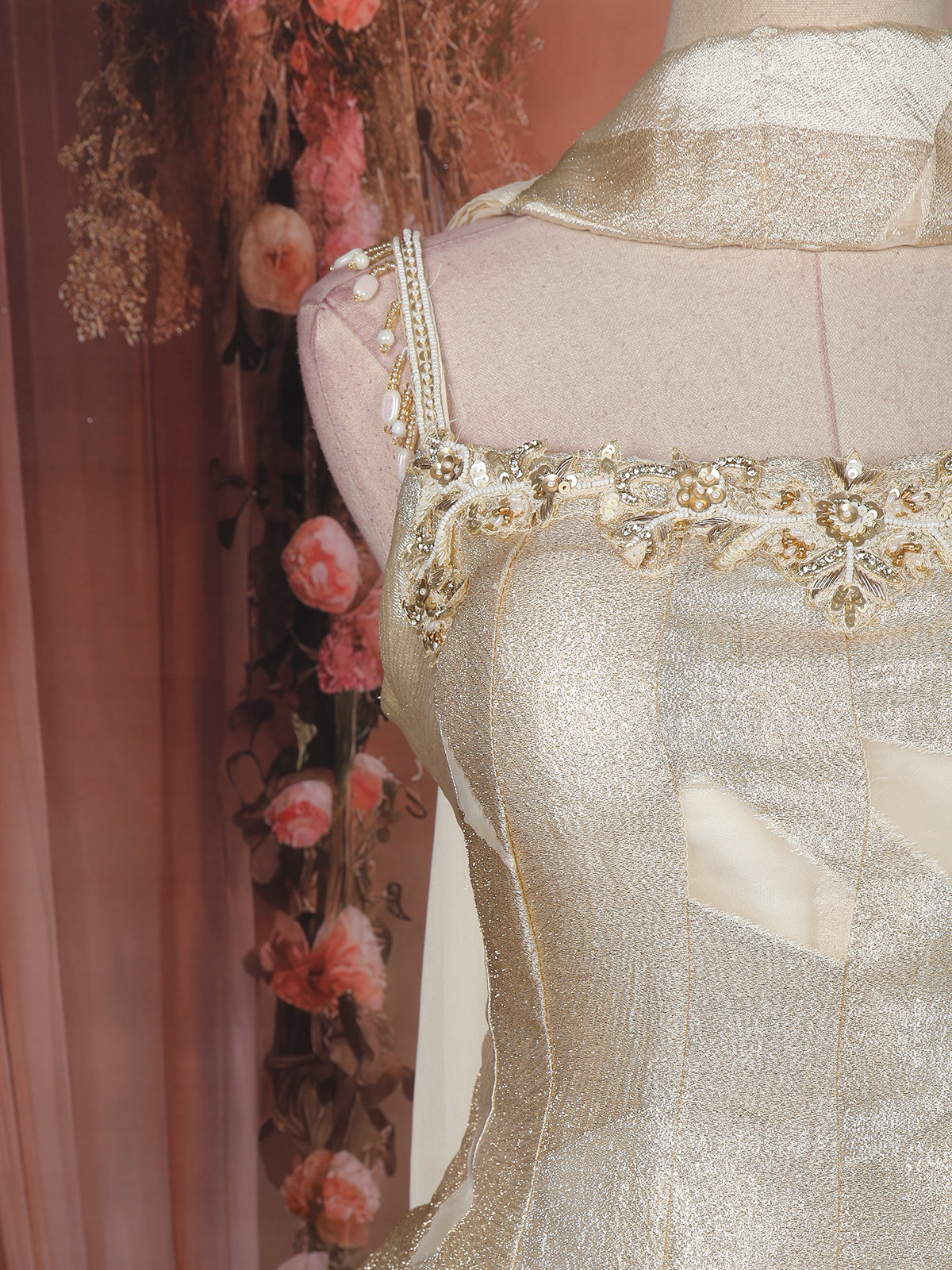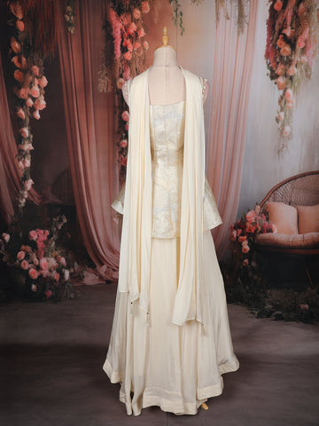 Paired with a soft, flowy ivory palazzo and a matching dupatta, this outfit offers effortless movement and a regal finish—perfect for festive events, receptions, sangeet evenings, and elegant celebrations.