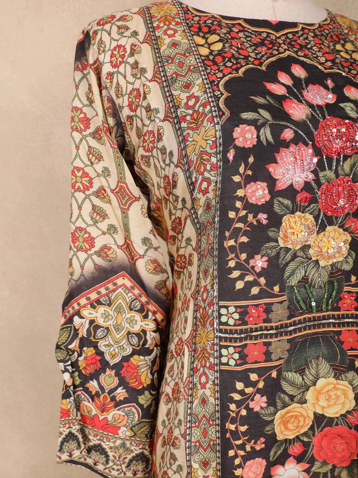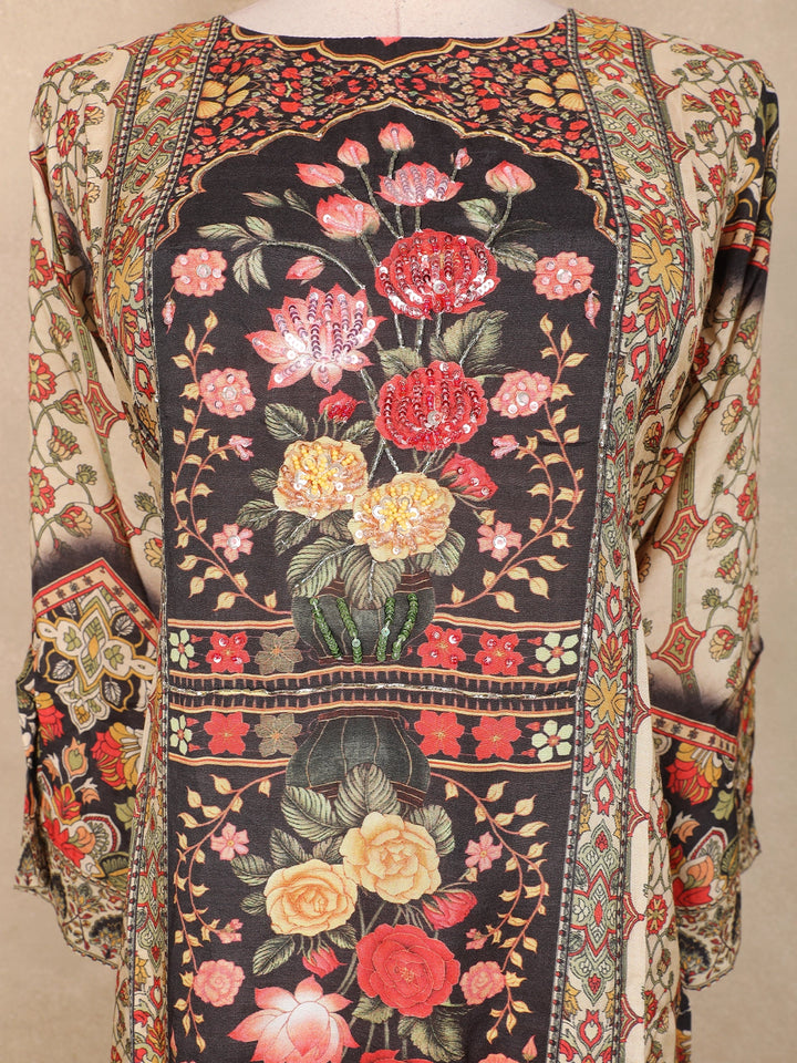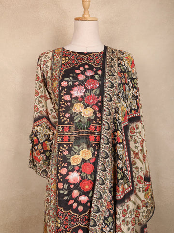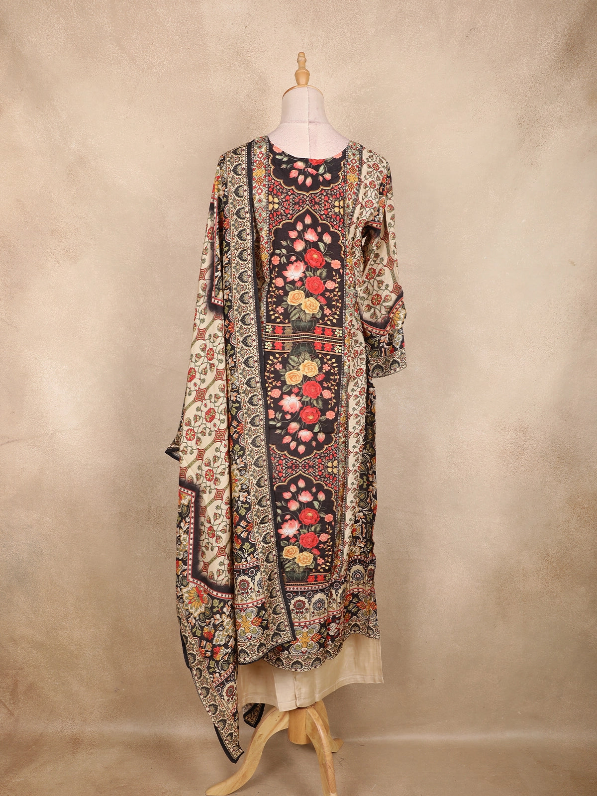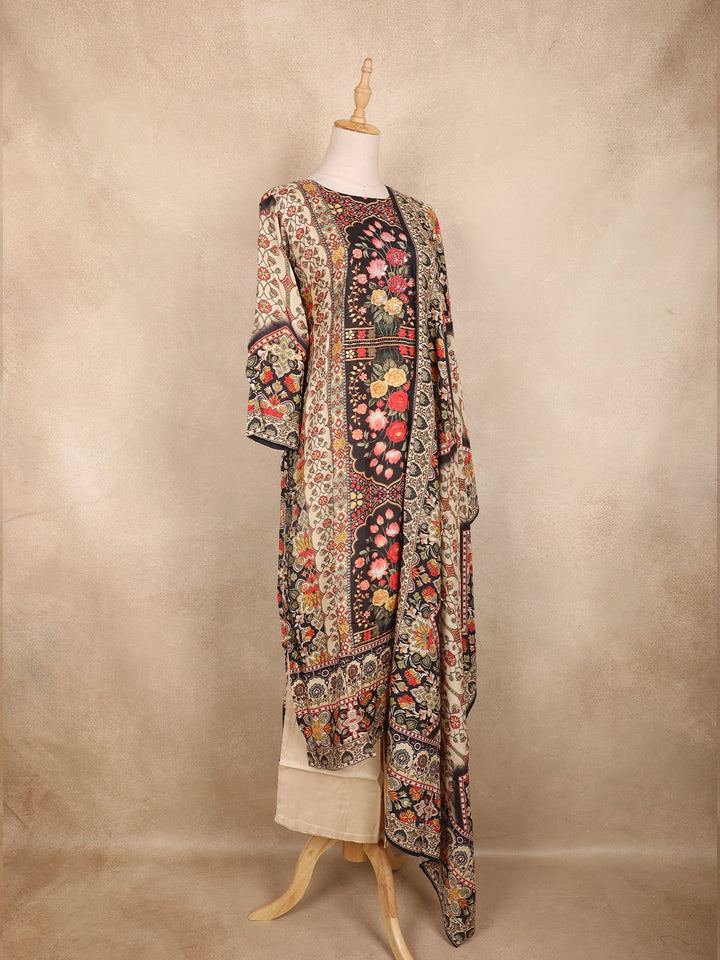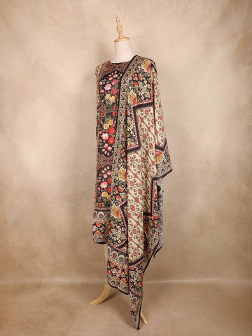Ivory Kashmiri Floral Printed Design Crepe Straight Cut Salwar Suit with Dupatta