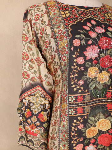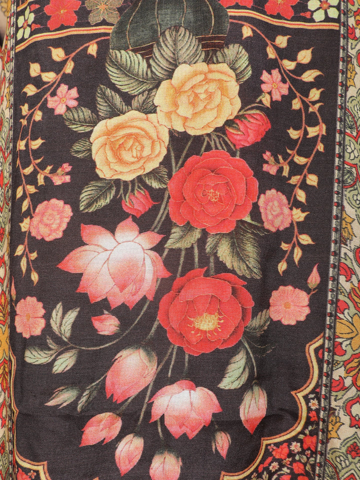 Step into timeless elegance with this Ivory Kashmiri Floral Printed Crepe Straight Cut Salwar Suit, a perfect blend of traditional charm and modern finesse. The kurta showcases intricate Kashmiri-inspired floral prints in rich tones of maroon, beige, and olive, creating a captivating contrast against the deep brown backdrop. Detailed printed borders along the neckline, sleeves, and hem enhance its classic ethnic appeal.