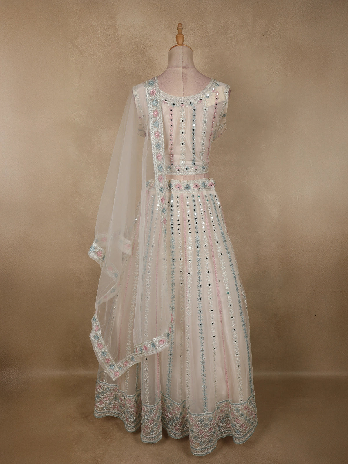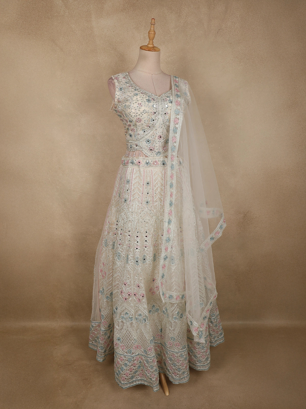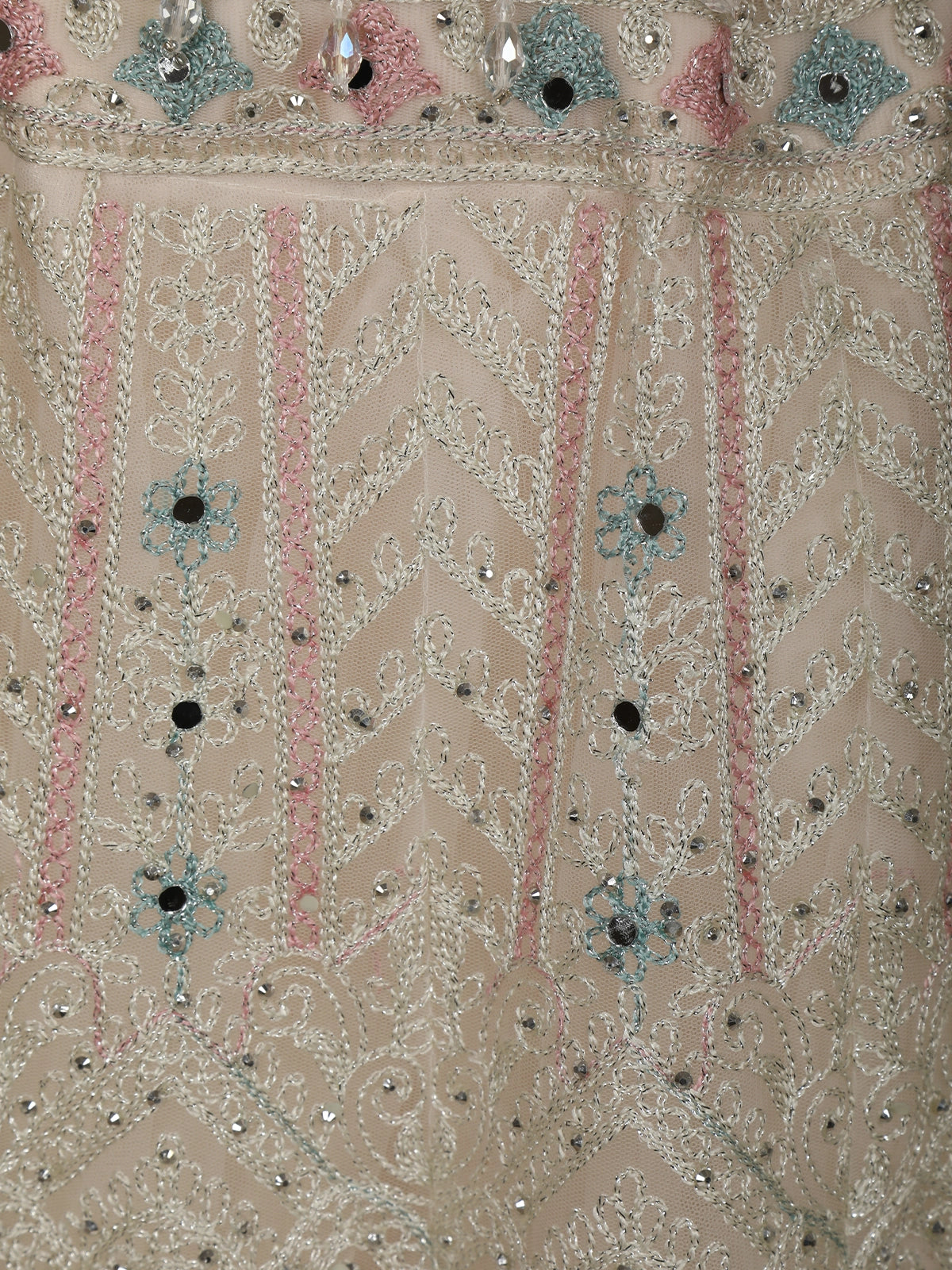 The lehenga skirt is exquisitely adorned with intricate mirror work and fine thread embroidery, arranged in delicate floral and geometric patterns. Subtle pastel accents in soft pink, mint, and powder blue add gentle contrast, while the mirror embellishments create a soft shimmer that enhances the overall richness without overwhelming the light base tone. The detailed hemline further elevates the lehenga’s graceful flow.