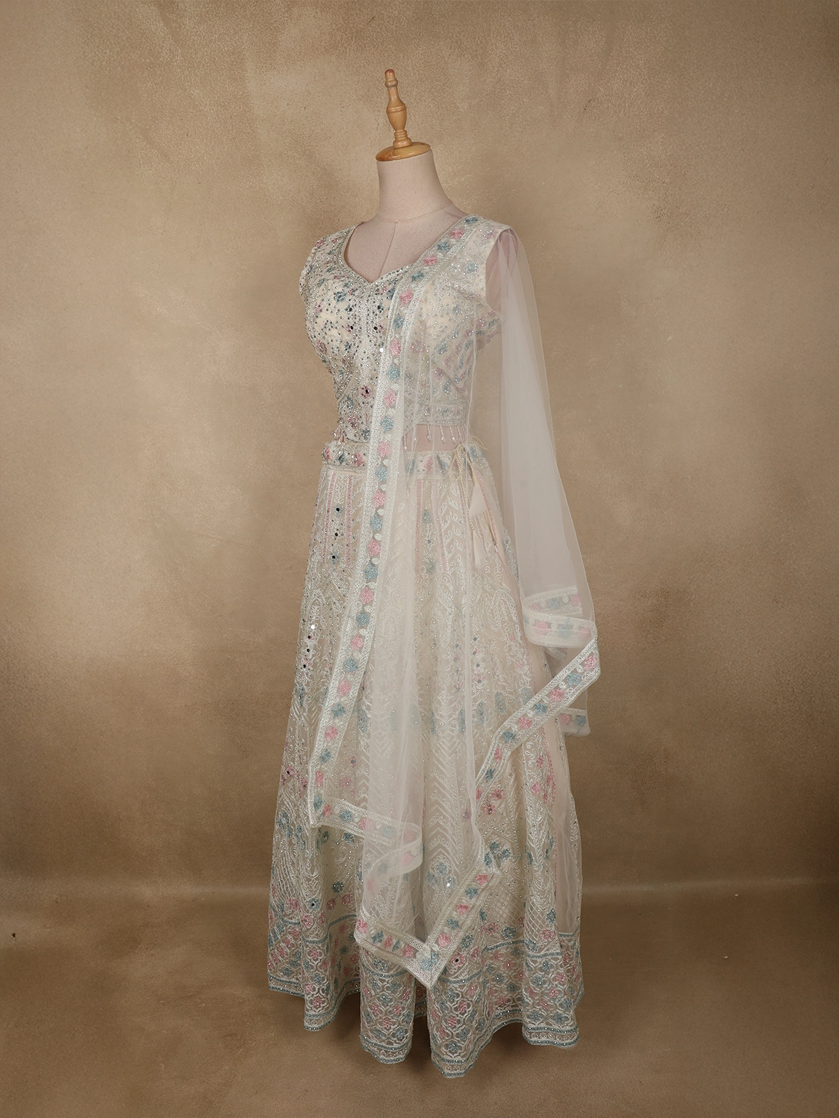Completing the ensemble is a sheer net dupatta in a matching ivory tone, finished with an embroidered pastel border that adds fluidity and finesse. The lightweight drape of the dupatta enhances the ensemble’s ethereal charm.